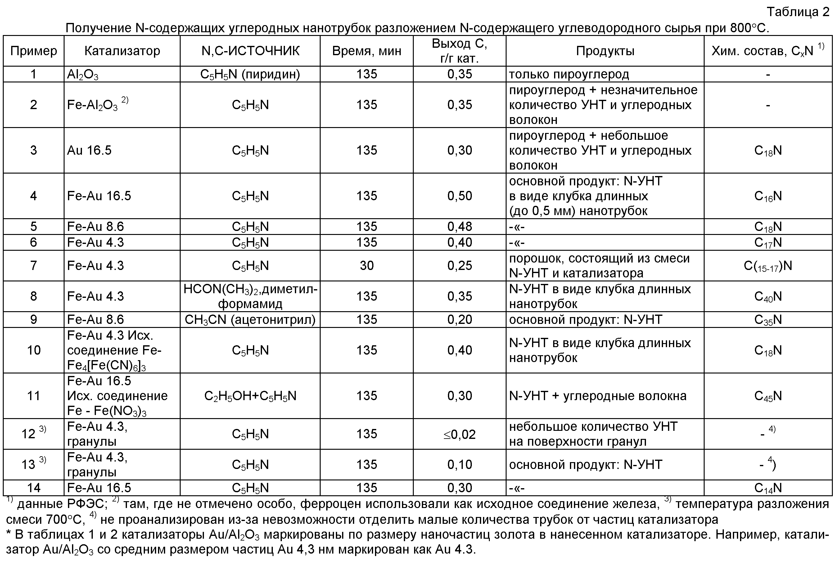 – N-содержащие углеродные материалы нанотрубчатой структуры получены каталитическим разложением N-содержащего соединения на катализаторах, содержащих частицы золота и железа в наноразмерной форме (подтверждено просвечивающей электронной микроскопией высокого разрешения и энергодисперсионной рентгеновской микроскопией).