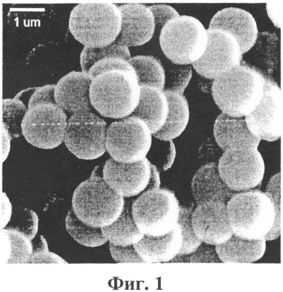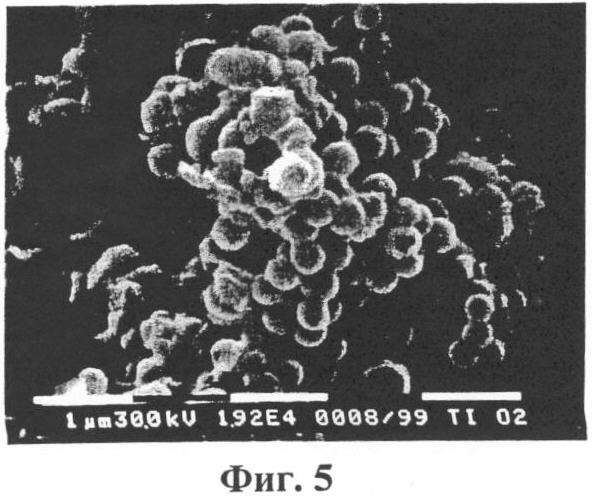 Снимок полученных таким образом полых оболочек из диоксида кремния, полученный с помощью сканирующего электронного микроскопа, приведен на фиг.3. На фиг.4 приведен снимок тех же оболочек, полученный с помощью просвечивающего электронного микроскопа.