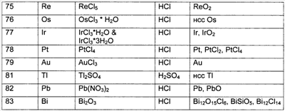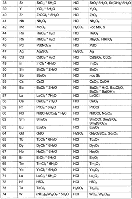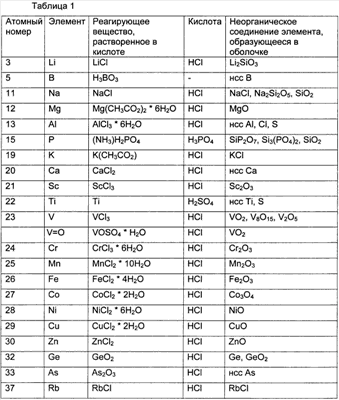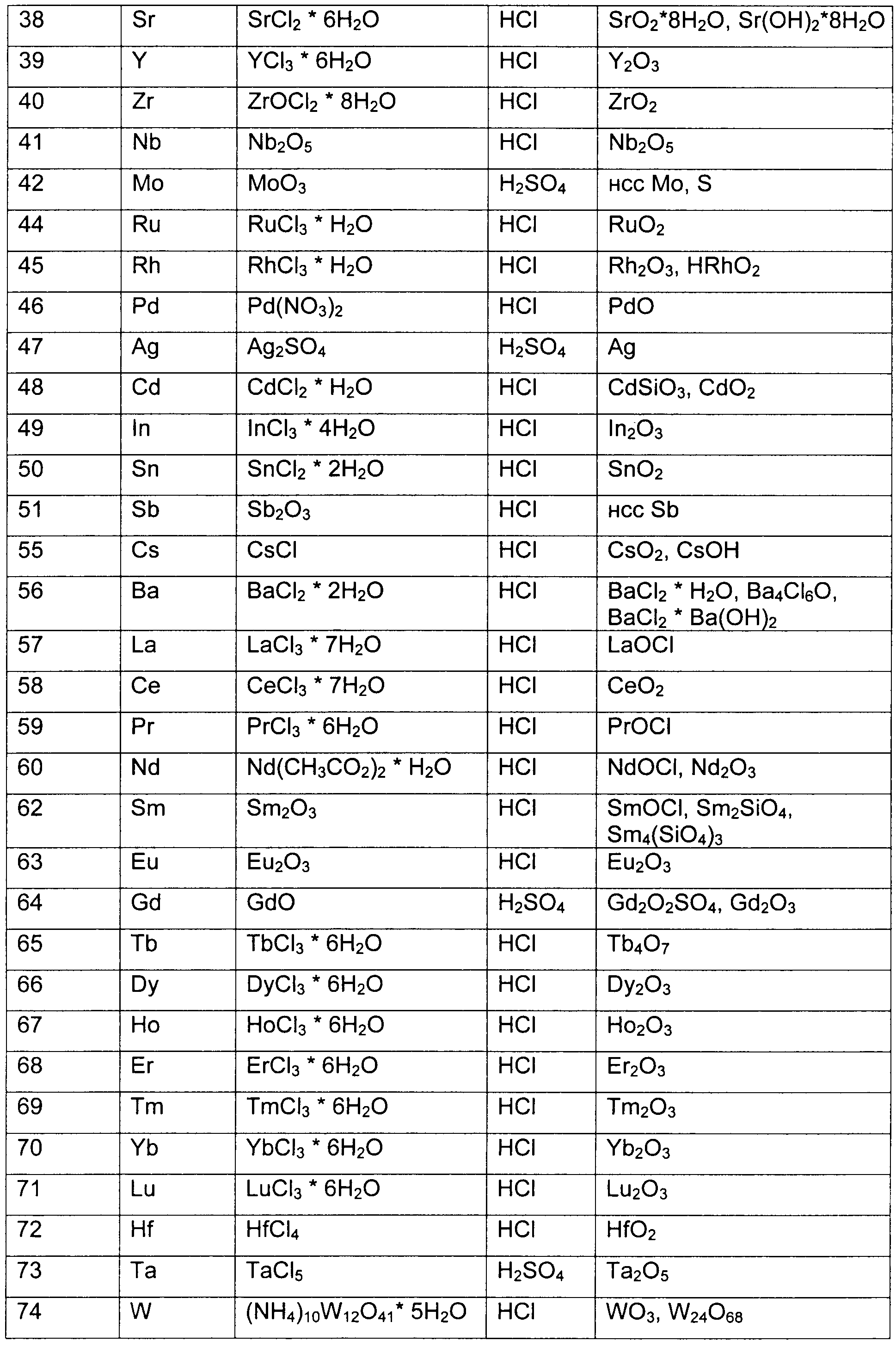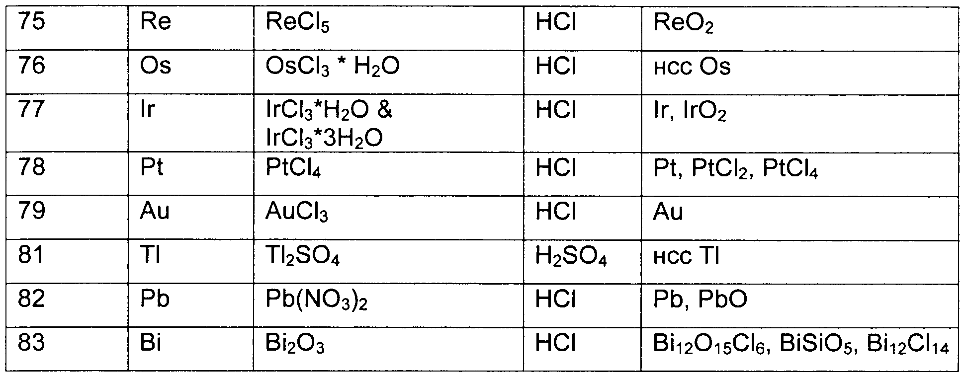 В табл.1 представлены неорганические соединения элементов, полученные в ходе описанной выше процедуры при использовании исходных соединений элементов и кислот, перечисленных в табл.1.