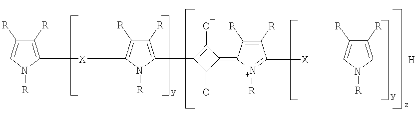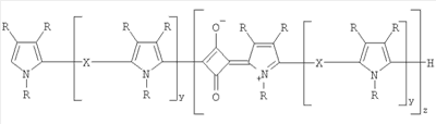 Поли-(пиррол-2-ил-скварен)ы получали путем нагревания с обратным холодильником эквимолярных количеств производных пиррола и квадратной кислоты в алкиловом спирте (или смеси растворителей, содержащих алкиловый спирт). Стандартная процедура получения, исходя из 1-метилпиррола, является следующей: эквимолярное количество 1-метилпиррола и квадратной кислоты нагревали с обратным холодильником в бутан-1-оле в течение 16 часов. После охлаждения сырой продукт отфильтровали и осушили. Растворимые материалы малой молекулярной массы удалили путем многократной экстракции продукта этилацетатом в течение 16 часов в аппарате Сокслета.