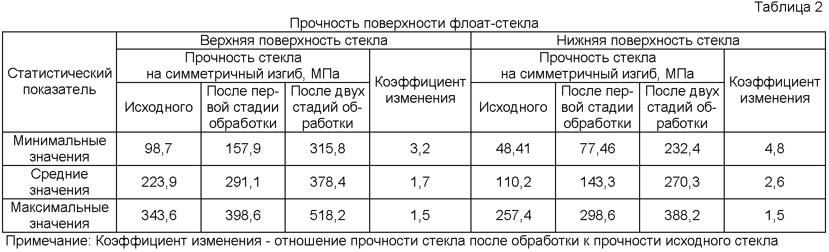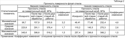 | Примечание: Коэффициент изменения – отношение прочности стекла после обработки к прочности исходного стекла |