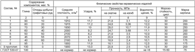 Составы керамической массы для изготовления строительных изделий и результаты испытаний образцов в зависимости от содержания исходных компонентов приведены в таблице.