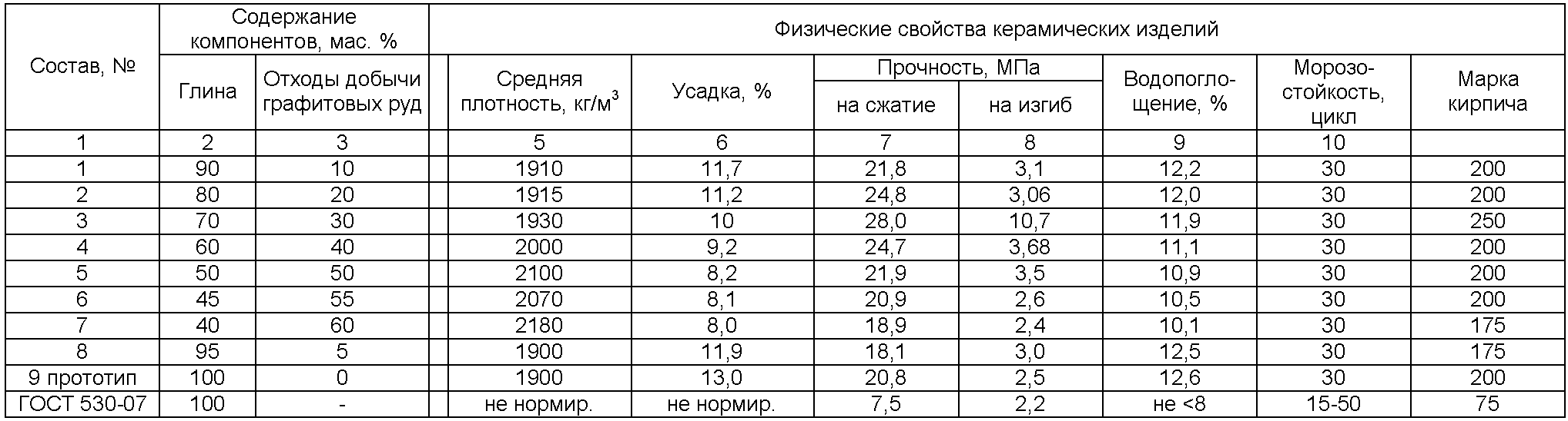 Берут подготовленные глину и графитсодержащую породу, смешивают, затем в сухую смесь добавляют воду из расчета получения нормальной формовочной влажности и оставляют для вылеживания на сутки. Затем проводят формование образцов и их сушку. Сушат образцы в сушильном шкафу при температуре 35-80°С, затем обжигают в печи при температуре 1000°С. После обжига образцов определяют их среднюю плотность, прочность, водопоглощение и морозостойкость. Предел прочности на сжатие определяют по ГОСТ 8462, плотность, водопоглощение и морозостойкость по ГОСТ 7025.