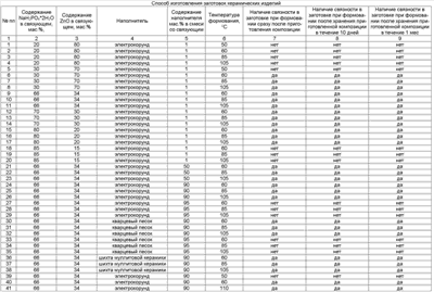 Изобретение относится к области формования керамических изделий из материалов, содержащих низкотемпературные фосфатные связующие, и может быть использовано для изготовления заготовок композиционных керамических изделий, в том числе для радиоэлектроники. Известен способ получения конструкционного материала на фосфатном связующем (патент РФ Недостатками описанного способа являются относительная сложность и многокомпонентность состава композиции, использование горючих и легковоспламеняющихся материалов, необходимость применения давления и невозможность хранения композиции для получения конструкционного материала. Задачей изобретения является расширение арсенала средств аналогичного назначения для получения заготовок керамических изделий. Поставленная задача решена за счет того, что в способе получения заготовок керамических изделий, также как в прототипе, смешивают фосфатное связующее, оксид металла и наполнитель, полученную смесь нагревают. Согласно изобретению в качестве фосфатного связующего используют смесь, состоящую из сухих порошков 30-80 мас.% дигидрофосфата натрия и 70-20 мас.% оксида цинка, к которой добавляют наполнитель в количестве 1-90 мас.% в смеси со связующим. Полученную композицию смешивают. При необходимости хранят, по крайней мере, один месяц. Формуют при температуре 60-105°С. В качестве наполнителя, например, могут быть выбраны электрокорунд, кварцевый песок, шихта муллитовой керамики, зола уноса и другие химически нейтральные порошки неорганических материалов. Экспериментально установлено, что количественное содержание дигидрофосфата натрия в фосфатном связующем в интервале 30-80 мас.% обусловлено тем, что именно в этом интервале обеспечивается связность формованной заготовки керамического изделия. Увеличение количества наполнителя вне зависимости от его типа свыше 90 мас.% в смеси со связующим также не обеспечивает связности формуемой заготовки. Использование сухого порошка дигидрофосфата натрия вместо жидких типовых фосфатных связующих позволяет увеличить срок хранения готовой для употребления смеси в сухом виде в течение, по крайней мере, одного месяца. В заявляемом способе используются свойства кристаллогидратов выделять связанную кристаллизационную воду при нагревании. Выделяющаяся при этом вода диссоциирует дигидрофосфат натрия, который в свою очередь реагирует с оксидом цинка, связывая всю полученную композицию. Формование заготовок при температурах, меньших 60°С, невозможно, так как не происходит выделение кристаллизационной воды из дигидрофосфата натрия и, вследствие этого, не инициируется реакция, обеспечивающая связность заготовок керамических изделий. Формование заготовок при температуре свыше 105°С нецелесообразно ввиду необоснованного увеличения энергозатрат. По сравнению с прототипом предлагаемый способ является более простым и безопасным. Изготовленные с его помощью заготовки могут быть подвергнуты механической обработке для придания окончательной формы керамических изделий. В таблице представлены результаты изготовления заготовок керамических изделий предложенным способом в зависимости от содержания дигидрофосфата натрия NaH2PO4*2H2O и оксида цинка в связующем, количества наполнителя в смеси со связующим и температуры отверждения. Способ изготовлен