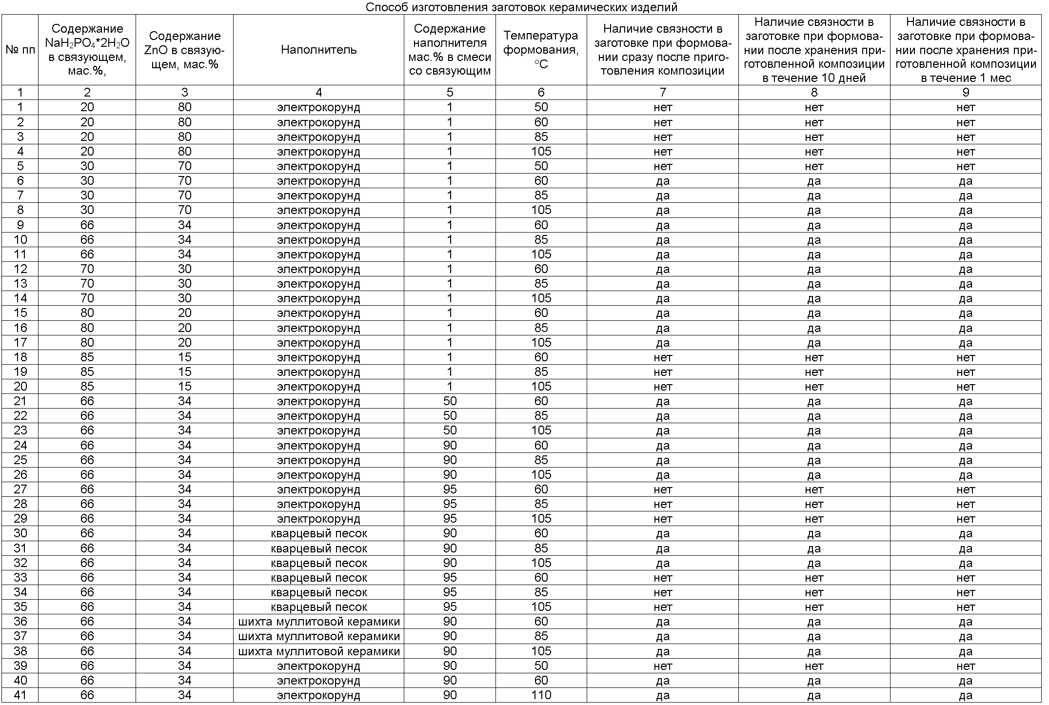 1. Способ изготовления заготовок керамических изделий, включающий смешение фосфатного связующего, оксида металла и наполнителя, нагревание полученной смеси, отличающийся тем, что в качестве фосфатного связующего используют смесь, состоящую из сухих порошков 30-80 мас.% дигидрофосфата натрия и 70-20 мас.% оксида цинка, к которой добавляют наполнитель в количестве 1-90 мас.% в смеси со связующим, полученную композицию смешивают, при необходимости хранят, по крайней мере, один месяц, затем формуют при температуре 60-105°С. 2. Способ по п.1, отличающийся тем, что в качестве наполнителя выбирают электрокорунд. 3. Способ по п.1, отличающийся тем, что в качестве наполнителя выбирают кварцевый песок. 4. Способ по п.1, отличающийся тем, что в качестве наполнителя выбирают шихту муллитовой керамики.