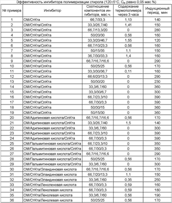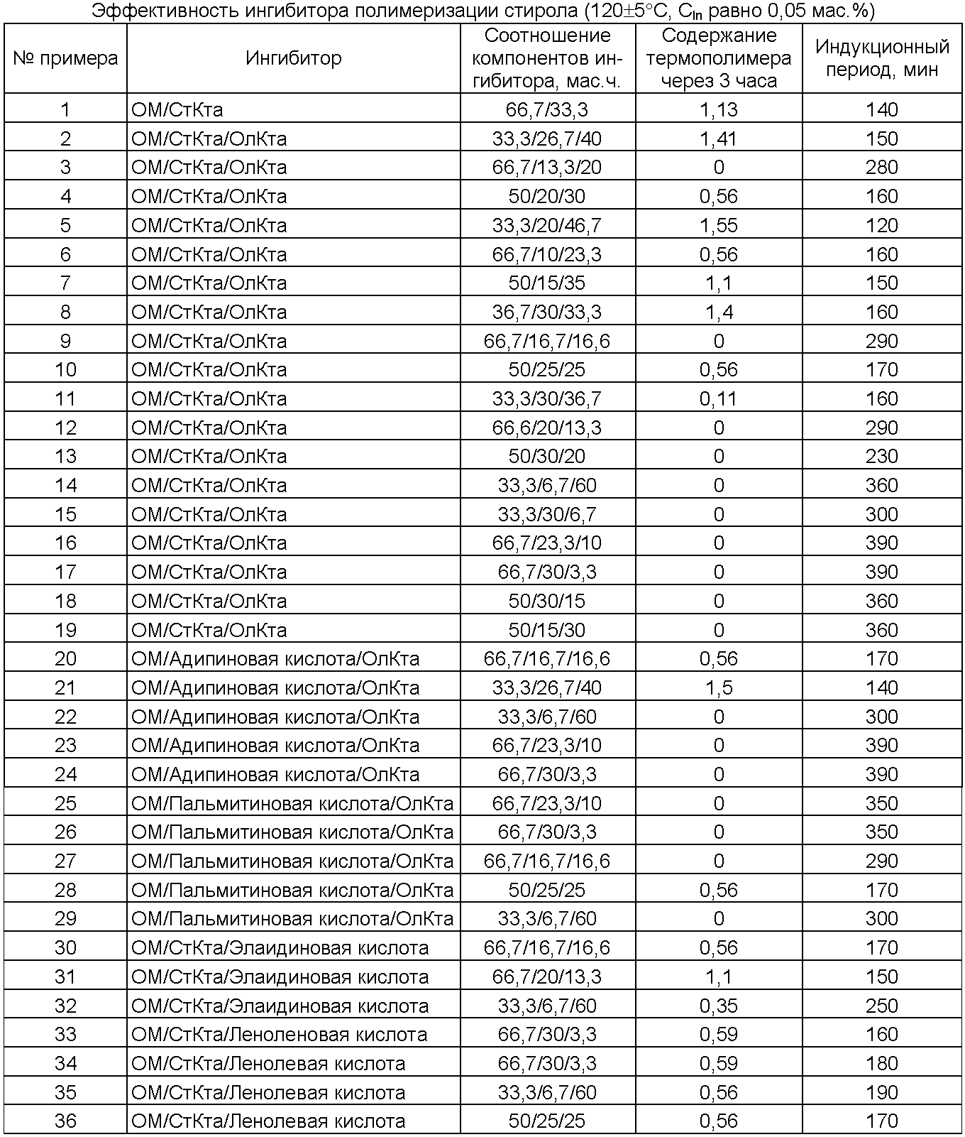 Примеры 5-19 выполнены аналогично примерам 2,3,4, при соотношении компонентов, мас.%: N,N-диметил-3,5-ди-трет-бутил-4-гидроксибензиламин 66,7-33,3: стеариновая кислота 30-6,6: олеиновая кислота 3,3-60. В качестве ингибитора полимеризации стирола используют 0,05 мас.% состава, см. таблицу. Примеры 20-24 выполнены аналогично примерам 2-4, при соотношении компонентов, мас.%: N,N-диметил-3,5-ди-трет-бутил-4-гидроксибензиламин 66,7-33,3: адипиновая кислота 30-6,6: олеиновая кислота 3,3-60. В качестве ингибитора полимеризации стирола используют 0,05 мас.% состава, см. таблицу. Примеры 25-29 выполнены аналогично примерам 2-4, при соотношении компонентов, мас.%: N,N-диметил-3,5-ди-трет-бутил-4-гидроксибензиламин 66,7-33,3: пальмитиновая кислота 30-6,6: олеиновая кислота 3,3-60. В качестве ингибитора полимеризации стирола используют 0,05 мас.% состава, см. таблицу. Примеры 30-32 выполнены аналогично примерам 2-4, при соотношении компонентов, мас.%: N,N-диметил-3,5-ди-трет-бутил-4-гидроксибензиламин 66,7-33,3: стеариновая кислота 30-6,6: элаидиновая кислота 3,3-60. В качестве ингибитора полимеризации стирола используют 0,05 мас.% состава, см. таблицу. Пример 33 выполнен аналогично примерам 2-4, при соотношении компонентов, мас.%: N,N-диметил-3,5-ди-трет-бутил-4-гидроксибензиламин 66,7-33,3: стеариновая кислота 30-6,6: леноленовая кислота 3,3-60. В качестве ингибитора полимеризации стирола используют 0,05 мас.% состава, см. таблицу. Примеры 34-36 выполнены аналогично примерам 2-4, при соотношении компонентов, мас.%: N,N-диметил-3,5-ди-трет-бутил-4-гидроксибензиламин 66,7-33,3: стеариновая кислота 30-6,6: ленолевая кислота 3,3-60. В качестве ингибитора полимеризации стирола используют 0,05 мас.% состава, см. таблицу. Как видно из примеров конкретного выполнения, заявляемый состав для ингибирования позволяет снизить полимеризацию стирола за счет уменьшения количества образующегося термополимера с 1,13 мас.% до 0 мас.% при расходе ингибитора 0,05 мас.%. Максимальный индукционный период до начала появления полистирола составляет 6,5 ч, тогда как по прототипу – 1,1 ч.