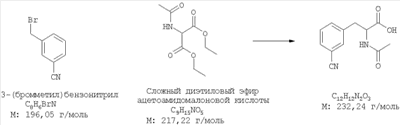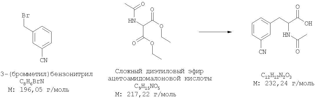 Диэтилацетамидомалонат (407 г) добавляют при комнатной температуре в атмосфере азота к этанолу (1 л). Суспензию нагревают примерно до 70°С и добавляют раствор метоксида натрия (130 г) в этанол (900 мл). В последующие 30 минут реакционную смесь перемешивают при такой же температуре. Далее в реакционный сосуд добавляют суспензию 3-бромметилбензонитрила (300 г) в этаноле (1,4 л). В реакционном сосуде в последующие 2,5 часа поддерживают температуру примерно 70°С. В дальнейшем в течение 1,5 часов добавляют по капле разбавленный раствор гидроксида натрия (2 н.; 2,2 л). В последующие 30 мин при температуре примерно 70°С проводят перемешивание и затем суспензию охлаждают до комнатной температуры. При комнатной температуре рН реакционной смеси путем добавления концентрированной соляной кислоты медленно (в течение примерно 1 часа) снижают примерно до 7. Органический растворитель удаляют путем дистилляции при пониженном давлении (<100 мбар; максимальная температура 60°С). Остающийся остаток растворяют в 1 н. NaOH (1 л). Водный раствор подвергают трехкратному экстрагированию этилацетатом (каждый раз по 350 мл). Затем охлаждают до 10°С. Водный раствор подкисляют концентрированной HCl (рН=1). Нужный продукт экстрагируют этилацетатом (три экстракции с использованием каждый раз по 1,2 л этилацетата). Объединенные органические фазы при пониженном давлении сгущают. Необходимый продукт оседает в виде белого осадка. Кристаллы собирают при 5°С в бюхнеровской воронке, промывают небольшим количеством этилацетата и высушивают при 45°С атмосфере азота.