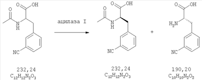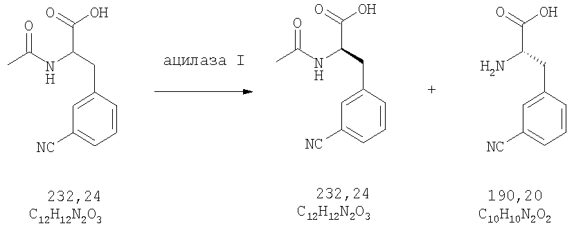 Ацетилцианофенилаланин (940 г) растворяют в 1 н. NaOH (4 л) при 37°С. Начальный рН 12,8 добавлением 4 н. HCl (приблизительно 120 г) снижают до 7,2. Добавляют ацилазу I (37,8 г). Для поддержания рН реакционной смеси на постоянном уровне примерно 7,2 к реакционной смеси непрерывно добавляют NaOH (1 н.). Через 72 часа пребывания при температуре 37°С осажденный продукт изолируют путем фильтрации при температуре 20°С. Кристаллы отмывают водой и в условиях пониженного давления при температуре примерно 40°С высушивают. Если фильтрат сгущают при пониженном давлении до одной трети первоначального объема, в осадок выпадает дополнительный продукт.