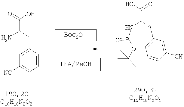 К суспензии цианофенил-L-аланина (425 г) в метаноле (4,5 л) добавляют триэтиламин (310 мл). При 25°С добавляют ди-трет-бутилдикарбонат (488 г). Реакционную смесь перемешивают в течение ночи. Органический растворитель удаляют при пониженном давлении и температуре 40°С. Остающееся масло оранжевой окраски разбавляют этилацетатом (3 л). Добавляют 1 н. HCl (2,3 л) и гетерогенный раствор в течение 30 минут сильно перемешивают. Проводят разделение фаз. Органическую фазу отделяют, экстрагируют водой и высушивают, применяя MgSO4. После фильтрации органическую фазу при 40°С и пониженном давлении переводят в сухое состояние. Если к остатку добавляют дихлорметан, получают кристаллы. Кристаллы путем фильтрации собирают и высушивают в атмосфере азота при 45°С.