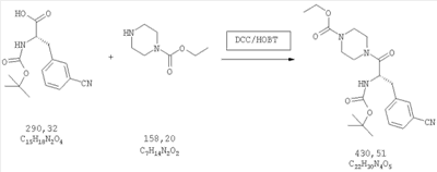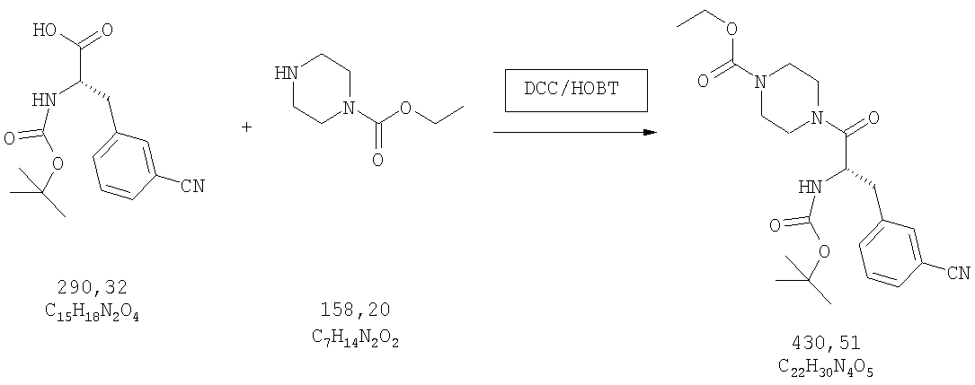 Вос-цианофенилаланин (554 г) и НОВТ (52 г) суспендируют в дихлорметане (2,7 л). Добавляют раствор DCC (453 г) в дихлорметане. Затем суспензию охлаждают до 10-15°С и в течение 30 минут добавляют по капле этоксикарбонилпиперазин, поддерживая в этот период вышеуказанную температуру. Реакционную смесь перемешивают в течение ночи. Мочевину отфильтровывают и удаляют. К фильтрату добавляют насыщенный раствор NaHCO3 (1,8 л). Гетерогенную смесь перемешивают в течение 30 минут и затем проводят разделение фаз. Органическую фазу экстрагируют водой (2 л) и затем, используя MgSO4, высушивают. Отфильтровывают MgSO4 и раствор концентрируют при пониженном давлении и температуре 30°С. Остающееся масло растворяют в этилацетате (300 мл). Раствор нагревают до точки кипения. Медленно добавляют диизопропиловый простой эфир (750 мл) до помутнения раствора. Температуру понижают до 50°С и дают смеси отстояться. Затем в течение 5 часов температуру понижают до 25°С. Продукт отфильтровывают и отмывают простым диизопропиловым эфиром, а затем высушивают в атмосфере азота при 40°С.