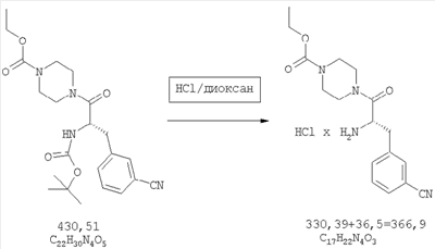 Вос-цианофенилаланинпипамид (442 г) растворяют в растворе HCl в диоксане (4 н.; 1,2 л). Во время добавления температура повышается с 25 до 32°С. Через 3 часа реакция заканчивается и к раствору прибавляют дихлорметан (1 л). Начинает осаждаться нужный продукт. Суспензию в течение ночи перемешивают. Избыток HCl удаляют путем откачивания. Продукт путем фильтрации отделяют, промывают простым диизопропиловым эфиром и при сильном разрежении высушивают при температуре 45°С.
