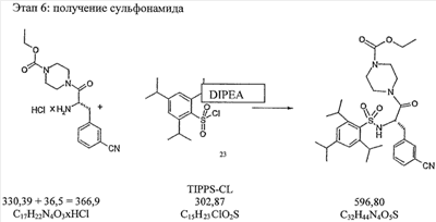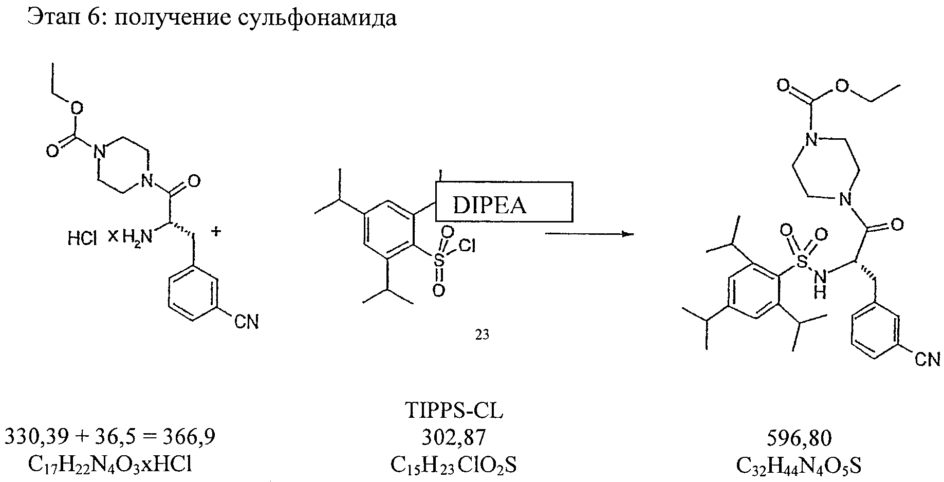 К суспензии цианофенил-L-аланинпипамида-HCl (257 г) в дихлорметане (1,6 л) при 250C добавляют 2,4,6-триизопропилфенилсульфонилхлорид (212 г). После добавления N-этилдиизопропиламина (238 мл) получают прозрачный раствор. Процесс добавления протекает экзотермично (повышение температуры с 25 до 35°С). К реакционной смеси после того, как ее в течение 2 часов перемешивали при комнатной температуре, добавляют воду (1,1 л). Фазы разделяют и органическую фазу один раз экстрагируют насыщенным раствором NaHCO3 (1,6 л) и один раз водой (0,5 л). Органическую фазу, используя MgSO4, высушивают, фильтруют и при пониженном давлении концентрируют. Получают бесцветное масло, которое при выстаивании в условиях комнатной температуры медленно выкристаллизовывается.