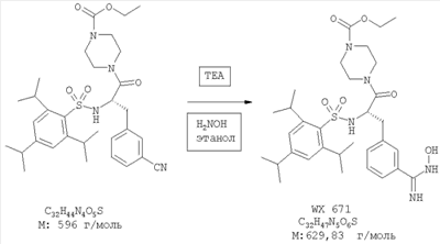 Получение производных 3-амидинофенилаланина, в частности N- -(2,4,6-триизопропилфенилсульфонил)-3-амидино-(L)-фенилаланин-4-этоксикарбонил-пиперазида (WX-UK1) и использование их в качестве ингибиторов урокиназы описано, например, в СН-А689611, WO 00/04954 и WO 00/17158, а также в статье Stürzebecher et аl. (Bioorg. Med. Chem. Let 9 (1999), 3147-3152). Применявшиеся при этом методы синтезирования обеспечивают, однако, как правило, относительно низкий выход продукта, так как в качестве нежелательного побочного продукта образуется гидролизированный TIPPS-OH. Проблема состоит в том, что желательный продукт реакции можно отделить от побочных продуктов только требующим больших затрат хроматографическим методом.