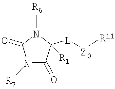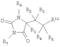 где заместители R1, R2, R3, R4, R5, R6, R7 и R11 определены широко. Эти производные активны в качестве ингибиторов ММР, в частности для фермента, превращающего фактор некроза опухоли (ТАСЕ), и аггриканазы, хотя никаких биологических данных продемонстрировано не было. Признаком структур этих производных является спиро-связь между гидантоиновым кольцом и его боковой цепью.