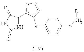Изобретение относится к новым соединениям- 5-[3-(4-бензилоксифенилтио)-фур-2-ил]-имидазолидин-2,4-дионам и их формулы (IV) или его фармацевтически приемлемым солям