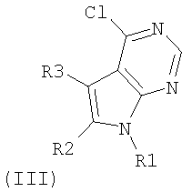 полученное реакцией ацетоина с амином и динитрилом малоновой кислоты, взятых в эквивалентных молярных количествах, где R1, R2 и R3 такие, как указано в формуле (I), перемешивают с муравьиной кислотой, взятой в 5-10-кратном избытке по массе, при температуре дефлегмации в течение от 1 ч до 2 дней, затем смесь выливают в ледяную воду, осажденный продукт отделяют и сушат, затем осуществляют реакцию полученного продукта, представляющего собой соответствующий 4-оксипирроло[2,3-d]пиримидин, с оксихлоридом фосфора, взятом в 5-10-кратном избытке по массе, при температуре дефлегмации в течение времени от 0,5 до 4 ч, затем смесь выливают на лед, выпавший в осадок имидоилхлорид общей формулы (III)