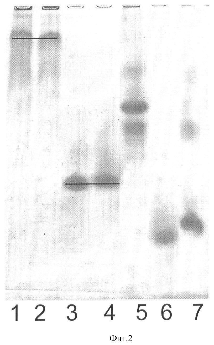 На фиг.2 показана типичная электрофореграмма комплексов белков с полисиаловой кислотой 22 кДа, полученных, как описано в примерах 6 и 7. Видно, что подвижность комплексов отличается от подвижности нативного белка.
