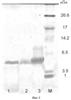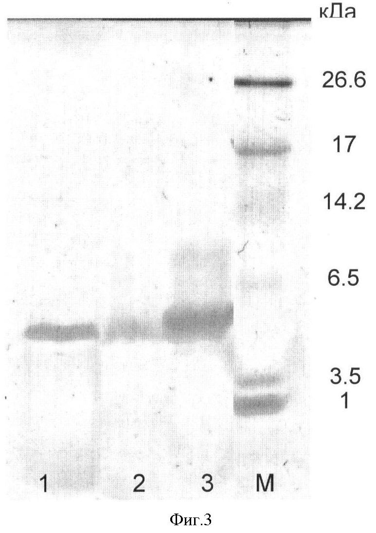 Фиг.3. Электрофореграмма инсулина и его комплекса с полисиаловой кислотой после инкубации с арахидоноилдофаминхиноном (AA-DAQ). Полиакриламидный гель, денатурирующие условия без восстановления, Трициновый буфер. 1 – комплекс инсулина с полисиаловой кислотой из примера 2, 2 – комплекс инсулина с полисиаловой кислотой из примера 2+AA-DAQ, 3 – инсулин + AA-DAQ, М – маркер.
