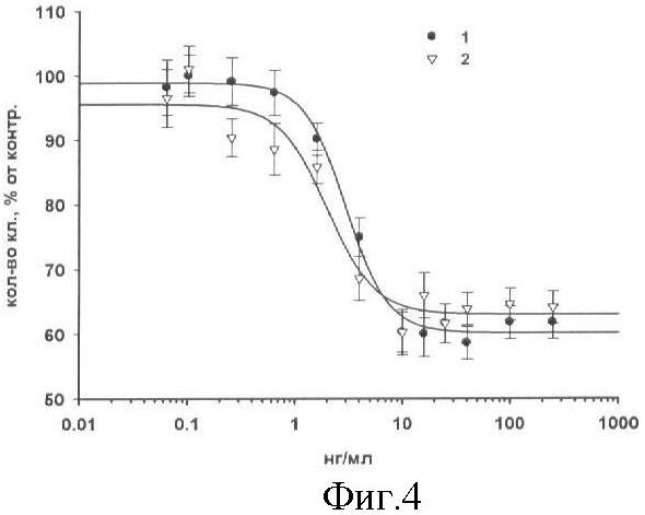 Фиг.4. Влияние препаратов интерферона-альфа 26 на пролиферацию клеток линии Daudi. 1 – комплекс интерферона и полисиаловой кислоты 22 кДа, полученный, как указано в примере 5,2, стандартный образец интерферона альфа 2в.