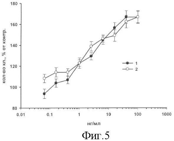 Фиг.5. Влияние препаратов гранулоцитарного колониестимулирующего фактора человека (ГКСФ) на пролиферацию клеток HL60, дифференцированных диметилсульфоксидом. 1 – препарат сравнения филграстим, 2 – комплекс ГКСФ и полисиаловой кислоты 22 кДа, полученный в примере 6.