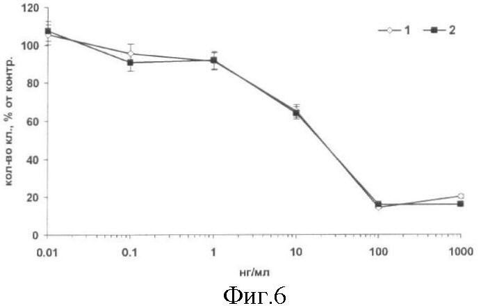 Фиг.6. Влияние препаратов интерферона-бета 1б на пролиферацию клеток линии Daudi. 1 – комплекс интерферона и полисиаловой кислоты 22 кДа, полученный как указано в примере 7, 2, стандартный образец интерферона бета 1б.