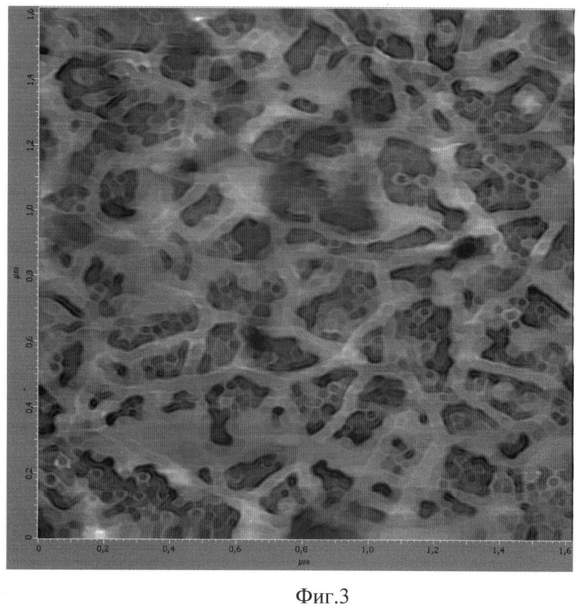 На фиг.3 показана микрофотография, полученная при помощи атомно-силовой микроскопии, структуры углеродной пленки, покрывающей железные наночастицы.
