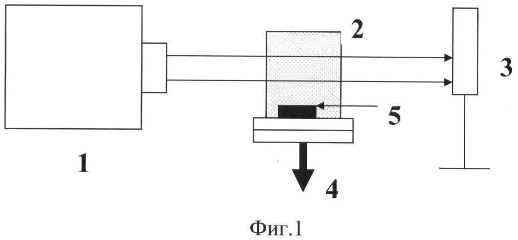 Способ можно уяснить, рассмотрев схему установки, представленную на фиг.1, на которой был проведен синтез металлоуглеродного нанопокрытия. 1 – Nd:YAg лазер, 2 – реакционный объем, 3 – измеритель энергии, 4 – магистраль к системе газоснабжения, 5 -подложка для синтеза нанопокрытия.