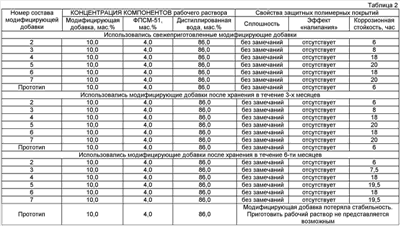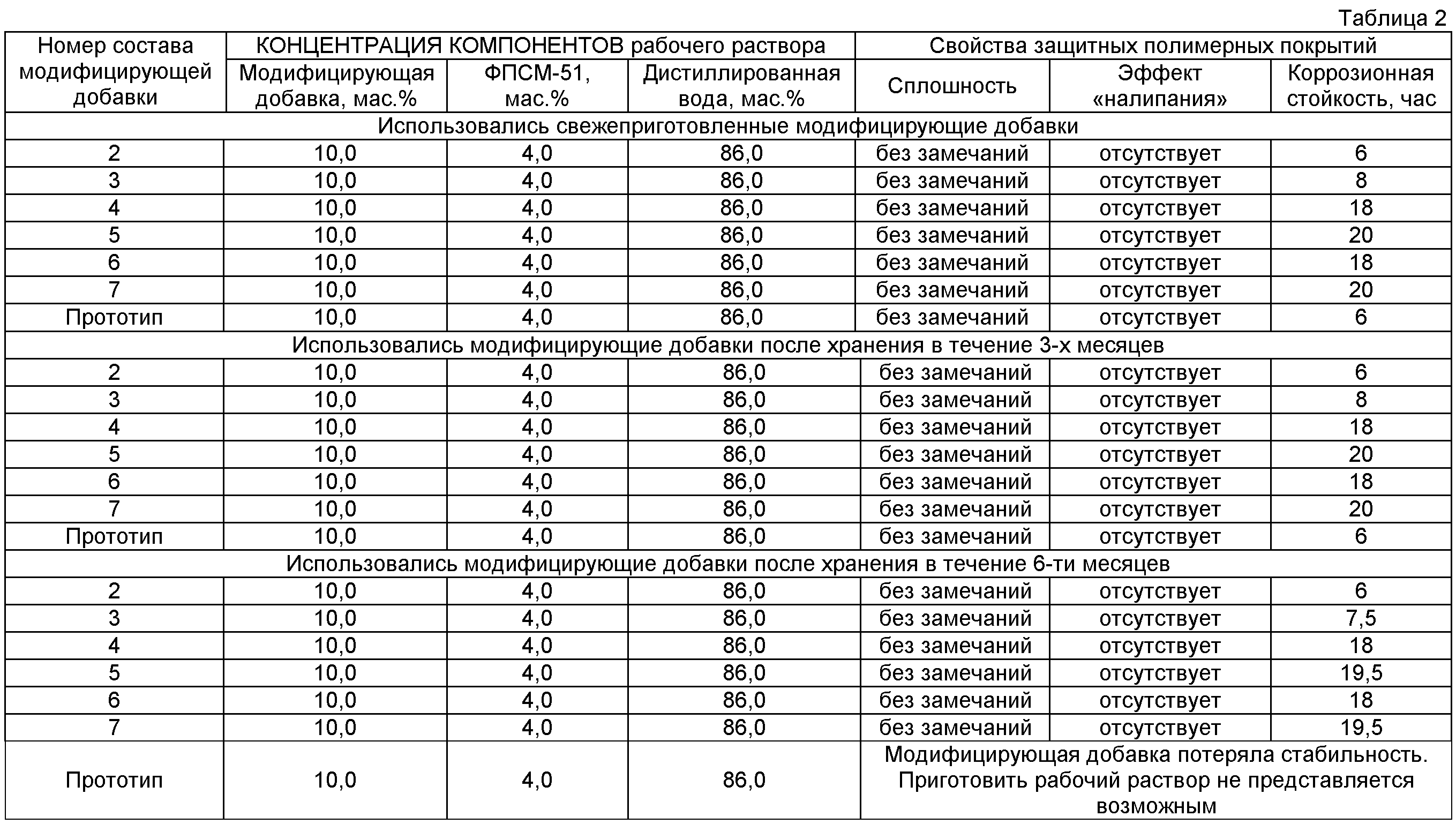 В результате введения в состав модифицирующей добавки диановой эпоксидной смолы в виде 80% раствора в смеси ксилола и этилцеллозольва, взятых в соотношении 5:1, была получена модифицирующая добавка повышенной стабильности, использование которой для модификации состава ФПСМ-51 приводит к устранению «эффекта налипания» и повышению коррозионной стойкости получаемых полимерных покрытий. Для экспериментальной проверки была приготовлена серия модифицирующих добавок, результаты восьми из них приведены в таблице В экспериментальной работе были использованы: – водоразбавляемая смола ВЭК-М, представляющая собой 60-70% раствор в смеси этилгликольацетата и бутанола эпоксиаминокаучукового аддукта, модифицированного меламиноформальдегидной смолой К-421-02, – уксусная кислота (ледяная) или фосфорная кислота; – 80% раствор в смеси ксилола и этилцеллозольва, взятых в соотношении 5:1 диановой эпоксидной смолы (ЭД-20 или ЭД-16); – дистиллированная вода. – состав ФПСМ-51, представляющий собой водорастворимый полимер полиорганссилоксана и сополимера бутадиена со стиролом. Модифицирующие добавки с различной концентрацией исходных компонентов готовили следующим образом: в водоразбавляемую смолу ВЭК-М при перемешивании добавляли уксусную кислоту или фосфорную кислоту, 80% раствор диановой эпоксидной смолы (ЭД-20 или ЭД-16) в смеси ксилола и этилцеллозольва, взятых в соотношении 5:1, и дистиллированную воду. Стабильность модификатора при хранении определяли по наличию необратимого расслоения раствора на «неразмешиваемый» осадок и воду. Для оценки свойств защитных полимерных покрытий изготавливали рабочие водные растворы на основе водоразбавляемого полимера полиоргансилоксана и сополимера бутадиена со стиролом (ФПСМ-51) с использованием модифицирующих добавок составами, указанными в Таблице Во всех случаях при приготовлении рабочих растворов (Таблица Покрытия на изделиях получали из рабочих растворов (таблица Коррозионную стойкость покрытий оценивали путем постоянного погружения образцов изделий с полимерным покрытием в 3% раствор NaCl до появления первых признаков коррозии. Сплошность покрытий оценивали путем обертывания испытуемых образцов изделий с полимерным покрытием в фильтровальную бумагу, смоченную в растворе следующей рецептуры: хлористый натрий 20 г, калий железистосинеродистый 7,6 г, вода дистиллированная 1 литр. Время выдержки 10 минут. Эффект «налипания» определяли путем наличия контакта частиц пороха с образцами изделий, на которые было нанесено защитное полимерное покрытие. Полученные результаты свойств защитных полимерных покрытий на образцах изделий на основе водоразбавляемого полимера полиоргансилоксана и сополимера бутадиена со стиролом с использование модифицирующих добавок с заявленными диапазонами концентраций исходных компонентов приведены в таблице Из таблицы Таким образом, экспериментально показано, что решение поставленной задачи достигается только при заявленной совокупности признаков.