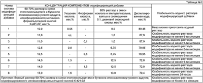 Изобретение относится к модифицирующим добавкам для изготовления защитных полимерных покрытий на основе водоразбавляемого полимера полиоргансилоксана и сополимера бутадиена со стиролом. Техническая задача – создание модифицирующей добавки с высокой стабильностью, не менее 6 месяцев с момента ее изготовления. Предложена модифицирующая добавка для водоразбавляемого полимера полиоргансилоксана и сополимера бутадиена со стиролом, включающая (в мас.%): 60-70%-ный раствор в смеси этилгликольацетата и бутанола эпоксиаминокаучукового аддукта, модифицированного меламиноформальдегидной смолой (11,0-14,0); воду, и дополнительно уксусную или фосфорную кислоту (0,1-1,5), а также 80% раствор в смеси ксилола и этилцеллозольва, взятых в соотношении 5:1, диановой эпоксидной смолы (1,0-12,5). 2 табл.
