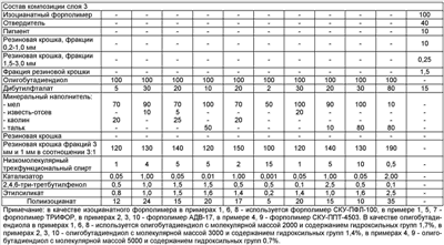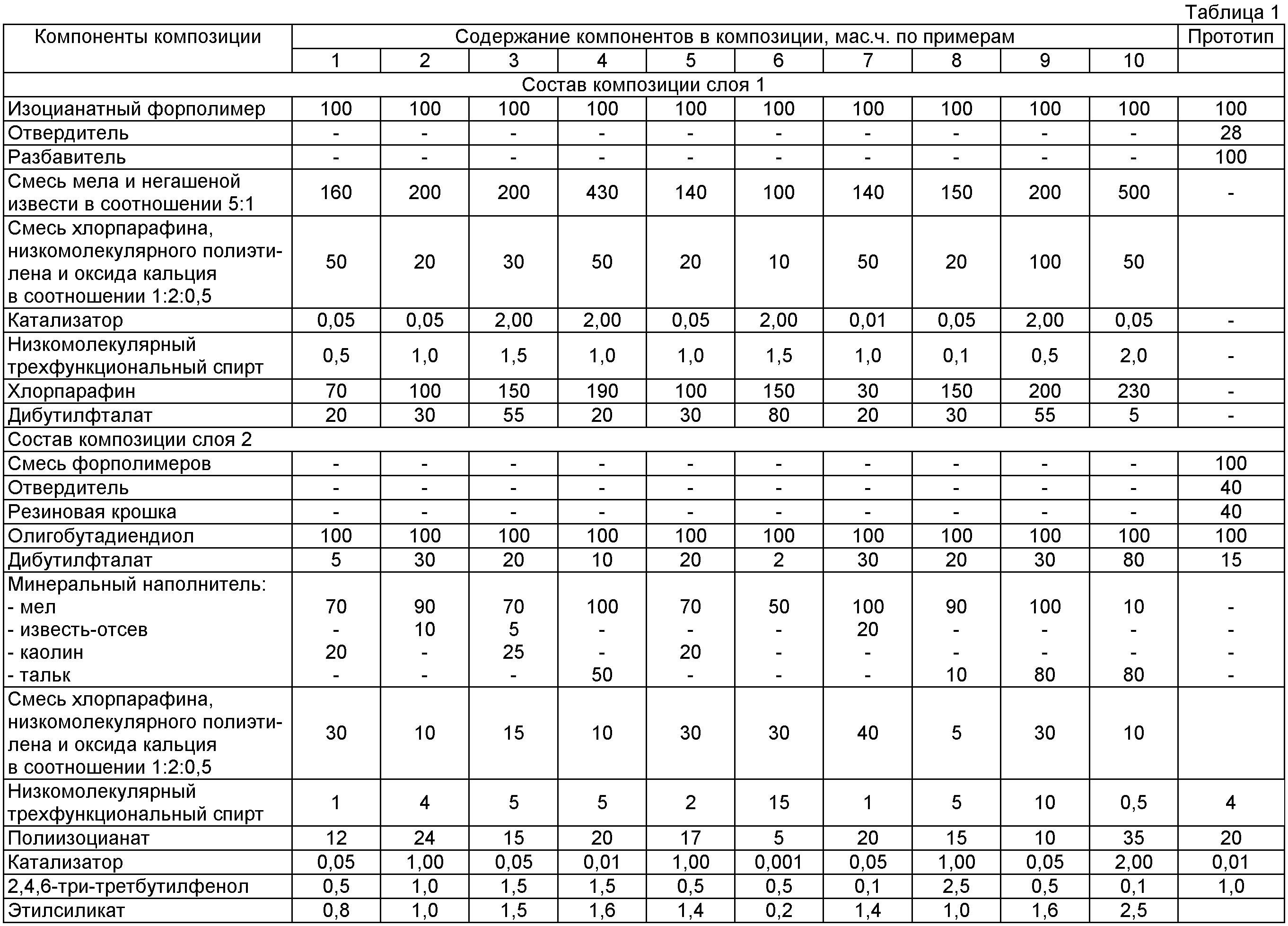 Изобретение относится к полимерным строительным композициям и может быть использовано для изготовления спортивных покрытий. Покрытие формируется путем нанесения на жесткое основание композиции, содержащей изоцианатный форполимер, смесь мела и негашеной извести в соотношении 5:1, смесь хлорпарафина, низкомолекулярного полиэтилена и оксида кальция в соотношении 1:2:0,5, катализатор, низкомолекулярный трехфункциональный спирт, хлорпарафин, пластификатор, и выдержки ее в течение 20-24 ч, нанесения на нее второго слоя полимерной композиции, содержащей олигодиендиол с молекулярной массой 2000-5000 и содержанием гидроксильных групп 0,7-1,7%, пластификатор, минеральный наполнитель, смесь хлорпарафина, низкомолекулярного полиэтилена и оксида кальция в соотношении 1:2:0,5, низкомолекулярный трехфункциональный спирт, полиизоцианат, катализатор, 2,4,6-три-третбутилфенол, этилсиликат, и выдержки в течение 20-24 ч, нанесения третьего слоя полимерной композиции, содержащей олигодиендиол с молекулярной массой 2000-5000 и содержанием гидроксильных групп 0,7-1,7%, пластификатор, минеральный наполнитель, резиновую крошку фракции 3 мм и 1 мм в соотношении 3:1, полиизоцианат, низкомолекулярный трехфункциональный спирт, катализатор, 2,4,6-три-третбутилфенол, этилсиликат, с последующей выдержкой в течение 20-24 ч. Технический результат заключается в повышении динамических и упругогистерезисных свойств покрытия. 2 табл.
