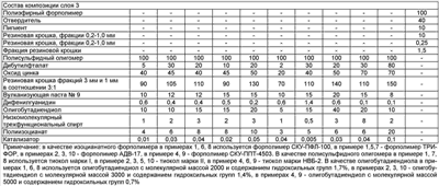 [а.с. СССР Покрытие, полученное по данному способу, имеет недостаточно высокий комплекс спортивно-технических показателей вследствие низкого уровня динамических и упругогистерезисных свойств, низкой стойкости к гидролитическому старению. Задачей предлагаемого изобретения является разработка способа получения композиции для спортивного покрытия, обладающего повышенными динамическими и упругогистерезисными показателями, стойкостью к гидролитическому и термоокислительному старению. Техническим результатом является повышение динамических и упругогистерезисных показателей, стойкости к гидролитическому и термоокислительному старению покрытия, полученного заявляемым способом. Поставленный технический результат достигается тем, что способ получения полимерного покрытия включает нанесение на жесткое основание композиции, содержащей, мас.ч.: изоцианатный форполимер 100; смесь мела и негашеной извести в соотношении 5:1 140-430; смесь хлорпарафина, низкомолекулярного полиэтилена и оксида кальция в соотношении 1:2:0,5 20-50; катализатор 0,05-2,00; низкомолекулярный трехфункциональный спирт 0,5-1,5; хлорпарафин 70-190; пластификатор 20-55, выдержку в течение 20-24 ч и нанесение второго слоя полимерной композиции, содержащей, мас.ч.: олигобутадиендиол с молекулярной массой 2000-5000 и содержанием гидроксильных групп 0,7-1,7% 100; пластификатор 5-30; минеральный наполнитель 90-150; смесь хлорпарафина, низкомолекулярного полиэтилена и оксида кальция в соотношении 1:2:0,5 10-30; низкомолекулярный трехфункциональный спирт 1-5; полиизоцианат 12-24; катализатор 0,01-1,00; 2,4,6-три-третбутилфенол 0,5-1,5; этилсиликат 0,8-1,6, выдержку в течение 20-24 ч, нанесение третьего слоя на основе полимерной композиции, содержащей, мас.ч.: полисульфидный олигомер 100; пластификатор 25-30; оксид цинка 40-50; резиновую крошку фракции 3 мм и 1 мм в соотношении 3:1 90-110; вулканизующую пасту В составе первого и второго слоев композиции используют смесь хлорпарафина, низкомолекулярного полиэтилена и оксида кальция, что позволяет повысить динамические показатели покрытия. Использование смеси хлорпарафина, низкомолекулярного полиэтилена и оксида кальция способствует более эффективной диссипации напряжений, возникающих вследствии динамического нагружения покрытия. Введение в состав композиции резиновой крошки, являющейся эластичным наполнителем, позволяет повысить динамические и упругогистерезисные показатели покрытия. Использование в качестве связующего во втором слое олигобутадиендиола позволяет получать материалы с повышенной гидролитической стабильностью. Комбинация фракций резиновой крошки способствует более эффективному образованию сплошной фазы эластичного наполнителя. Использование для получения третьего слоя полисульфидного олигомера, вулканизаты которого обладают высокой термоокислительной стойкостью, озоностойкостью, водостойкостью, позволяет повысить эксплуатационные характеристики покрытия в целом. При осуществлении заявленного изобретения покрытие имеет более высокий уровень динамических и упругогистерезисных показателей, повышенную стойкость к термоокислительному и гидролитическому старению. Как видно из табл.1 и 2, при содержании в первом слое смеси мела и негашеной извести менее 140 мас.ч. снижают упруго-прочностные свойства покрытия. Увеличение содержания смеси 