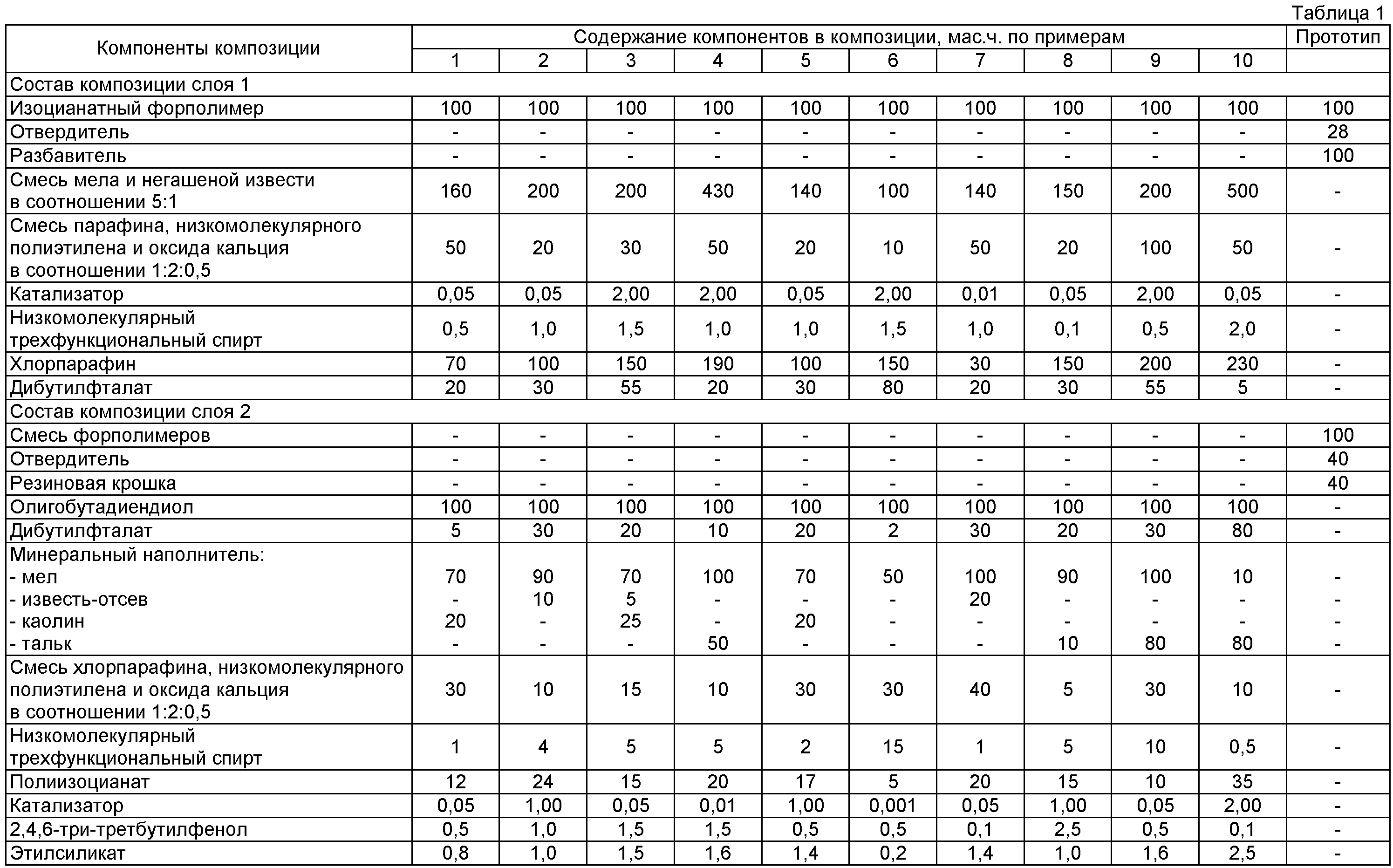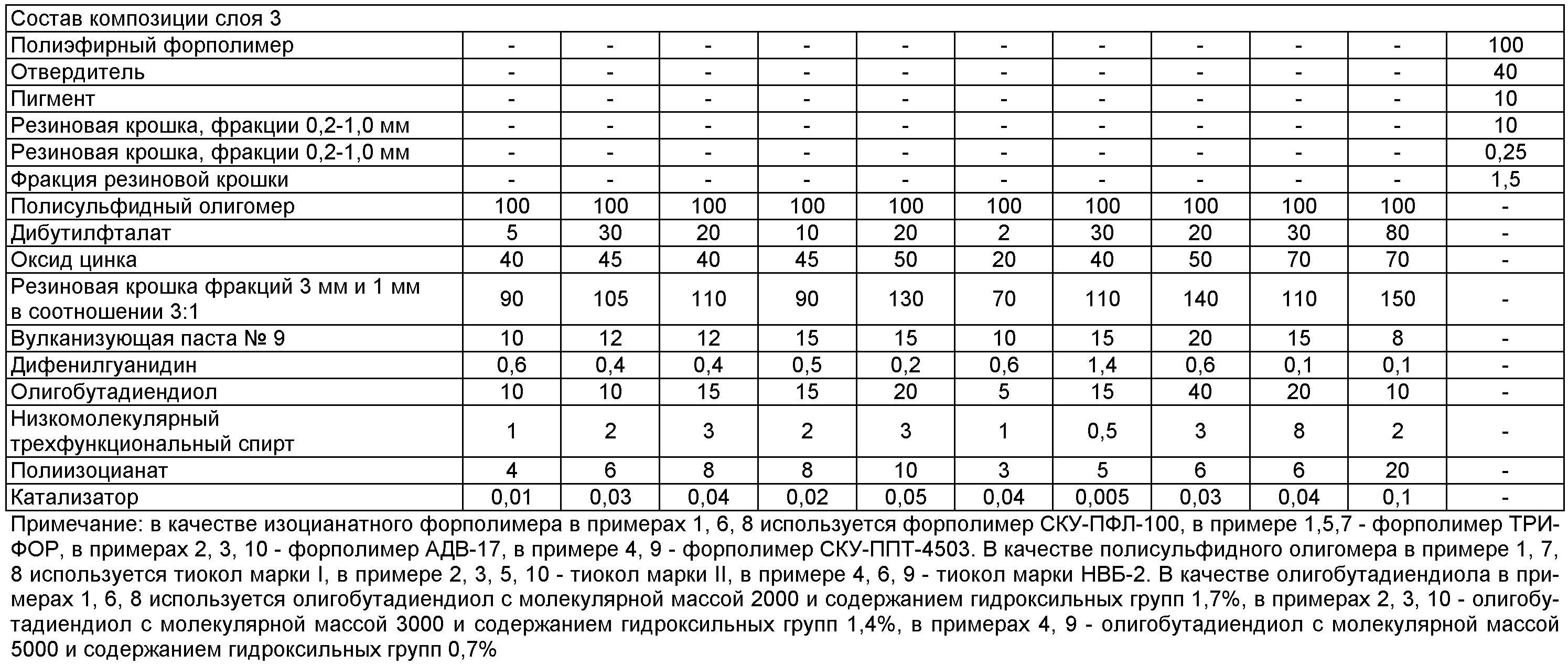 Изобретение относится к полимерным композициям и может быть использовано для изготовления эластомерных спортивных покрытий. Известен способ получения композиций для полиуретанового покрытия путем смешения уретанового форполимера с наполнителем, катализатором, полиолом, пластификатором [патент РФ Недостатком способа является низкий уровень динамических и упругогистерезисных показателей, низкая стойкость к гидролитическому старению. Известен способ получения композиции для покрытия, включающей олигобутадиендиол, пластификатор, минеральный наполнитель, трехфункциональный низкомолекулярный спирт, полиизоцианат, оловооргнический катализатор, 2,4,6-три-третбутилфенол, этилсиликат [Патент РФ Недостатком способа является низкий уровень динамических и упругогистерезисных показателей, низкая стойкость к термоокислительному старению. Наиболее близким является способ получения покрытий на основе изоцианатного полиэфирного форполимера, включающий послойное нанесение на жесткое основание композиции на основе изоцианатного полиэфирного форполимера, при этом сначала наносят композицию при следующем соотношении компонентов, мас.ч.: