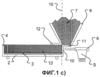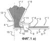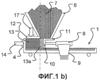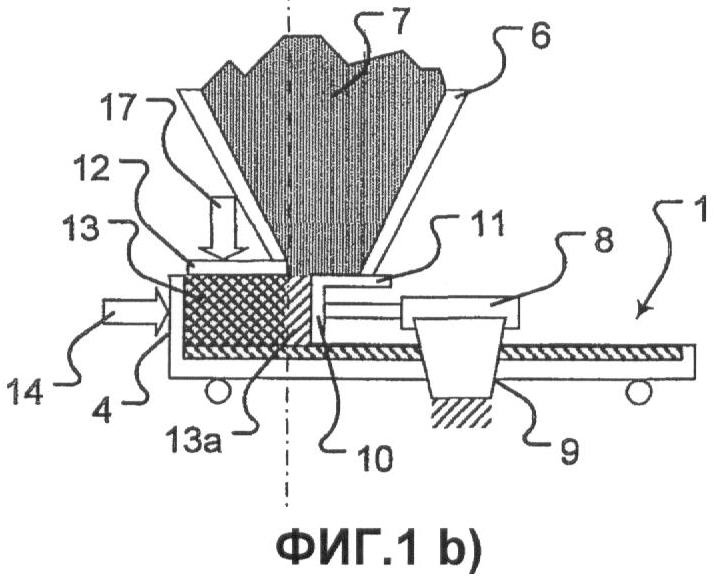 На фиг.1b) гидравлические цилиндры 8 частично выведены в положение, когда запорная плита 11 частично закрывает выпуск качающегося желоба 6. Дальше можно видеть область 13а непосредственно перед нажимной плитой, которая отмечена простой штриховкой, в которой заключена предварительно спрессованная угольная шихта. Уже возникший за счет неоднократного процесса прессования угольный брикет 13 формуется между упорной стенкой 4, кожухом 12 брикета и нажимной плитой 10 гидравлического цилиндра 8. Направление прижимного усилия кожуха 12 брикета обозначается стрелкой 17.
