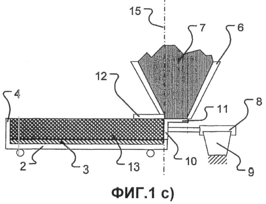 Головная часть показанного на фиг.1а) гидравлического цилиндра 8 включает в себя, по существу, вертикально стоящую нажимную плиту 10 и связанную с ней и ориентированную по горизонтали запорную плиту 11. Кожух 12 брикета, который на фиг.1а) представлен в приподнятом положении, чтобы упорная стенка 4 могла проходить под ним, расположен над тележкой 1 и проходит по горизонтали к поддону 3 для брикета. Можно видеть, что в области между представленной здесь в заднем исходном положении нажимной плитой 10 гидравлического цилиндра 8, упорной стенкой 10 и ниже качающегося желоба 6 угольная шихта 7 высыпается на поддон 3 для брикета.