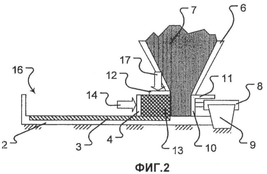 На фиг.2 показано соответствующее изобретению устройство, причем пресс-форма сформирована как ванна 16, и днище 2, по существу, неподвижно. Не жестко связанная с пресс-формой упорная стенка 4 тормозится аналогично вышерассмотренному устройству, так что достигается необходимое давление для изготовления угольного брикета 13. Угольный брикет 13 изготовляется на поддоне 3 для брикета и формуется также между упорной стенкой 4, кожухом 12 брикета и нажимной плитой 10 гидравлического цилиндра 8. Направление прижимного усилия кожуха 12 брикета обозначается стрелкой 17.