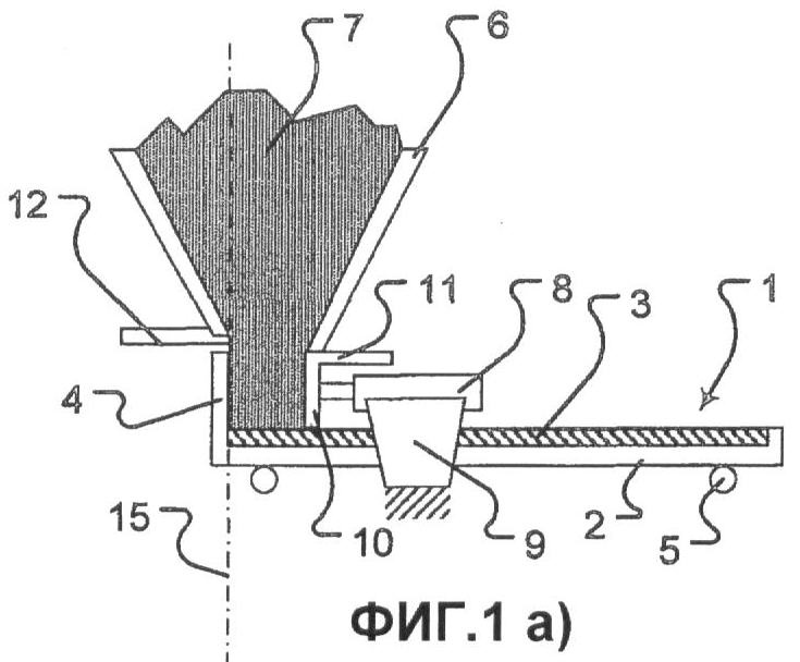 На фиг.1а) можно видеть пресс-форму, конструктивно выполненную в виде тележки 1, которая, по существу, состоит из днища 2, расположенного на нем, и извлекаемого поддона 3 для брикета, который содержит расположенную впереди в направлении движения упорную стенку 4 и расположенные под днищем 2 колеса 5. Над тележкой 1 расположен качающийся желоб 6, который наполнен угольной шихтой 7 и она высыпается в тележку 1 и соответственно на поддон 3 для брикета. Далее на фиг.1а) представлен гидравлический цилиндр 8, который закреплен на устройстве 9 крепления, которое проходит параллельно качающемуся желобу 6 и перекрывает мостом лежащую под ним тележку 1, так что она проходит насквозь под этим мостом устройства 9 крепления гидравлического цилиндра 8.