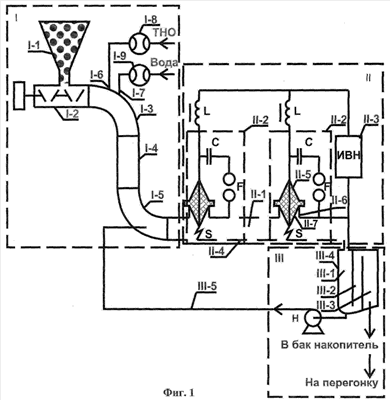Электроимпульсный измельчительный блок II включает реактор электроимульсного измельчения II-1, электроразрядные ячейки II-2, источник питания высокого напряжения II-3. Реактор электроимпульсного измельчения II-1 реализован в горизонтально расположенной металлической трубе II-4, являющейся корпусом реактора, в которую через проходные изоляторы II-5, закрепленные в металлических стаканах II-6, приваренных к трубе, введены потенциальные электроды II-7. Торцы электродов II-7 и противолежащая поверхность трубы II-4 образуют разрядные промежутки S. Электроразрядная ячейка II-2 предназначена для возбуждения импульсного электрического разряда в разрядном промежутке S реактора измельчения, включает последовательно соединенную электрическую цепь из двухэлектродного воздушного разрядника F, конденсатора С (ИК-100кВ-0,1 мкФ), потенциального электрода II-7 и разрядного промежутка S. Питание каждой электроразрядной ячейки осуществляется от источника высокого напряжения II-3, потенциальный вывод которого соединен через токоограничительные элементы L (дроссель) с клеммой соединения одного электрода разрядника F с выводом конденсатора С каждой электроразрядной ячейки, а заземленный вывод источника подключен к клемме соединения второго электрода разрядника F с трубой II-4 (см. работу В.И.Курец и др.). Выход реактора блока II соединен с приеморазделительным блоком III, предназначенного для отделения нерастворенных частиц угля от жидкого продукта, который содержит бункер III-4, разделенный перегородками на три отсека (III-1, III-2, III-3), насос Н, вход которого патрубком соединен в основании с отсеком III-1, в который поступает жидкий продукт, а выход насоса Н соединен трубопроводом III-5 со штуцером, установленным в отводе I-5 блока I, таким образом организована циркуляционная система. Из отсека III-3 блока III жидкий продукт поступает в бак-накопитель и затем на дальнейшую перегонку.