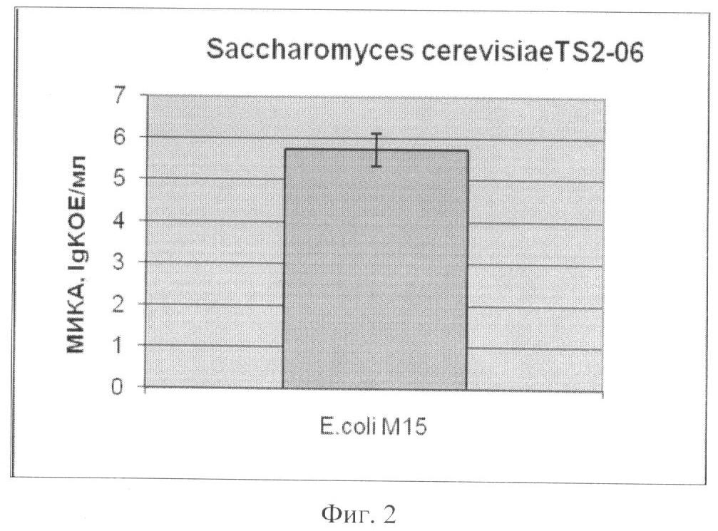 Штамм Saccharomyces cerevisiae TS2-06 под « 1072 ГУНИИЭМ» проявляет выраженные антагонистические свойства по отношению к Е. coli. Антагонистическая активность Saccharomyces cerevisiae TS2-06 представлена на фиг.2, на которой изображена минимальная ингибирующая концентрация Saccharomyces cerevisiae TS2-06, при которой происходит подавление роста Е. coli. Как видно из фиг.2, необходимо около 105 в 1 мл клеток Saccharomyces cerevisiae TS2-06, чтобы подавить рост 108 в 1 мл клеток Е. coli.
