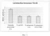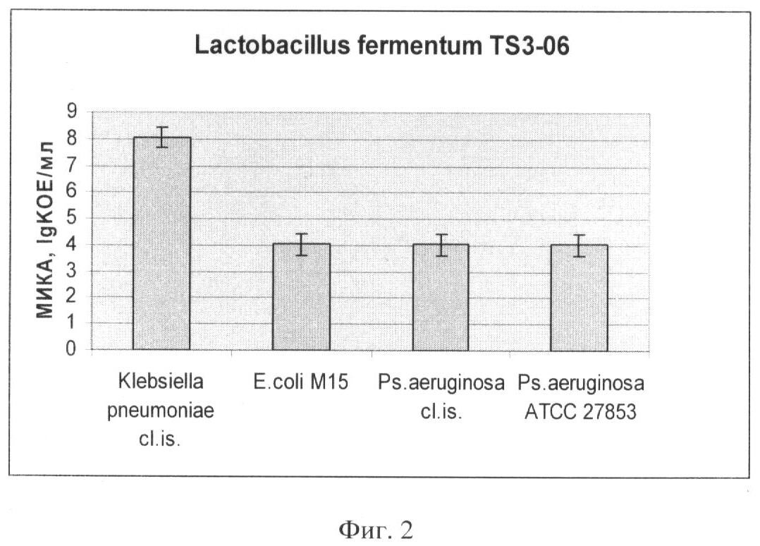 Штамм Lactobacillus fermentum TS3-06 под « 1073 ГУНИИЭМ» проявляет выраженные антагонистические свойства по отношению к Klebsiella pneumoniae, Е. coli, Pseudomonas aeruginosa. Антагонистическая активность Lactobacillus fermentum TS3-06 по отношению к перечисленным видам микроорганизмов представлена на фиг.2, на которой изображена минимальная ингибирующая концентрация антагониста, при которой происходит подавление роста индикаторных культур. Как видно из фиг.2, необходимо около 108 в 1 мл клеток Lactobacillus fermentum TS3-06, чтобы подавить рост 108 в 1 мл клеток Klebsiella pneumoniae и всего 10 в 1 мл клеток Lactobacillus fermentum TS3-06 для подавления роста 108 в 1 мл клеток Е. coli или Pseudomonas aeruginosa.