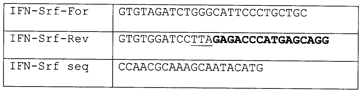 Полученная плазмида длиной 10680 п.о. была трансформирована в E.coli штамма С600 и охарактеризована рестриктным анализом. Кроме того, было секвенировано с использованием праймера IFN-Srf seq (Таблица 1) сочленение генов гамма-интерферона и hSP-C. В результате определения нуклеотидной последовательности была обнаружена замена А на G, что, однако, не вызвало замены аминокислотного остатка на другой (SEQ ID No 1).