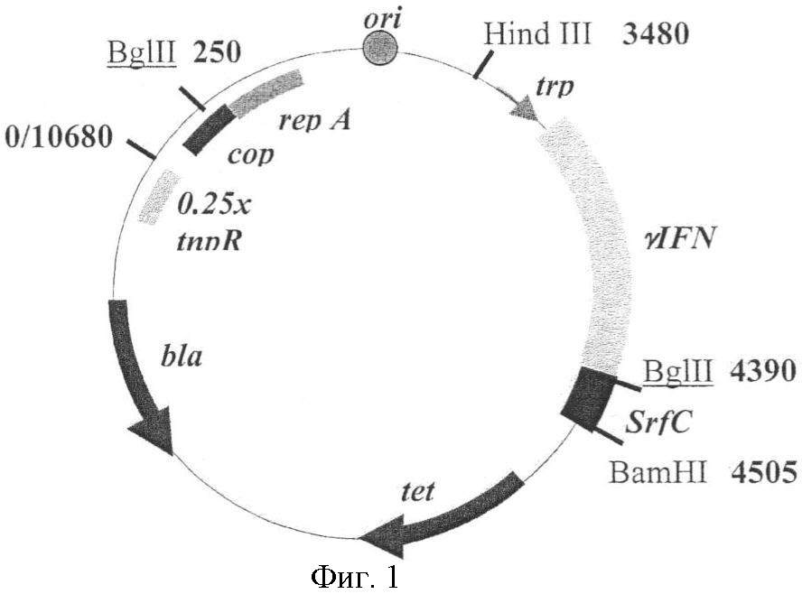 Фиг.1. Схема рекомбинантной плазмиды pBEU-IFN-SPC. На схеме обозначены: черные стрелки – гены bla и tet, определяющие устойчивость к антибиотикам ампициллину и тетрациклину (ген tet инактивирован в данной плазмиде); гены rep A, cop, tnp R, контролирующие run-away репликацию; серой стрелкой – trp промотор; серым сектором – последовательность гена гамма-интерферона, черным – кДНК hSP-C; отмечены сайты узнавания некоторых рестриктаз.