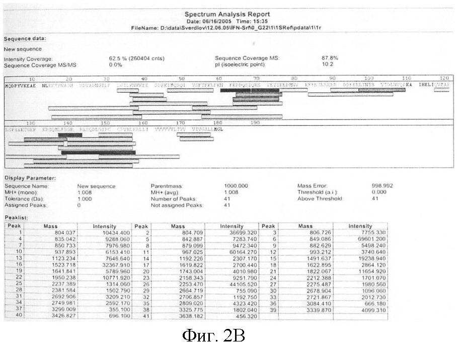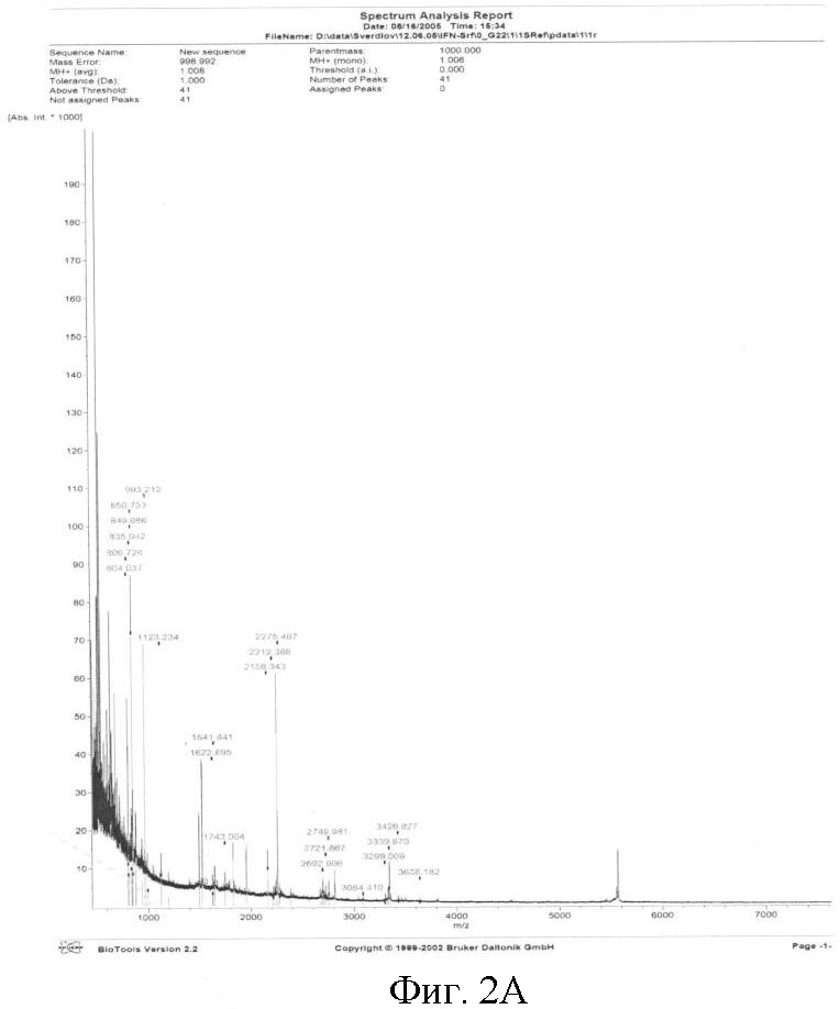 Для масс-спектрометрии (MALDI-TOF) белок обрабатывали трипсином и молекулярную массу образовавшихся пептидов определяли на приборе Brucker Daltonik (Германия). Выявленные при масс-спектрометрии пептиды покрывают до 88% последовательности гибридного белка и соответствуют как гамма-интерферону, так и hSP-C (фиг.5).