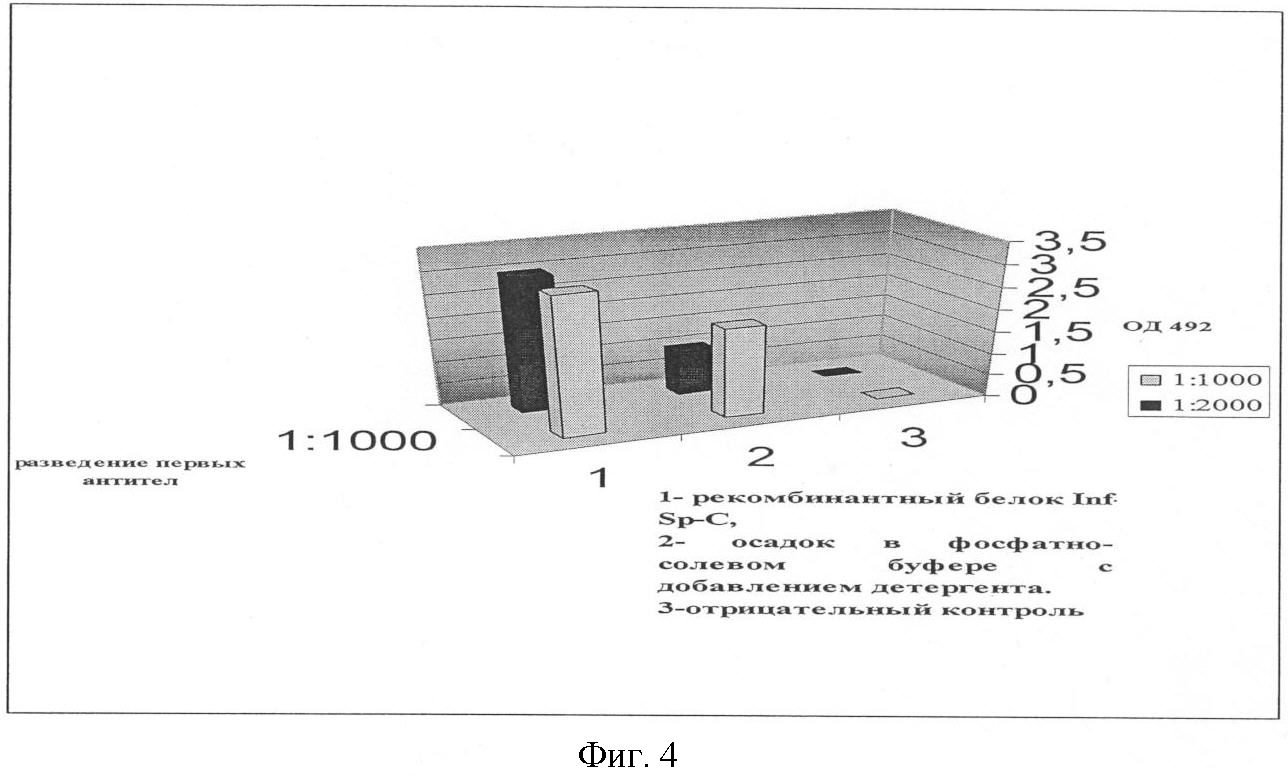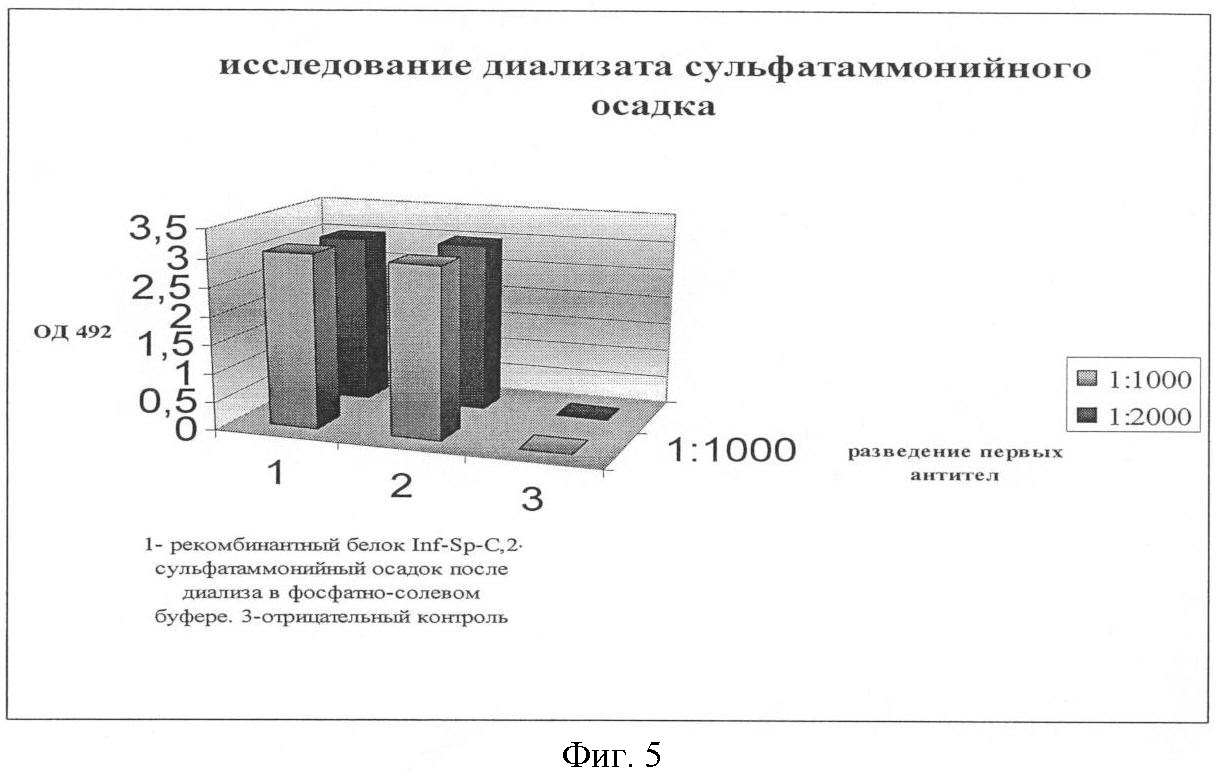 1.5. Методом ИФА анализировали супернатант. Для этого его наносили в лунки полистирольного планшета – полеченный супернатант. Инкубировали в течение часа. Инкубировали с белком БСА (забивка). Наносили антитела против белка INF-Sp-C. Инкубировали в течение часа. Промывали. Наносили вторые меченные пероксидазой антитела. Инкубировали в течение часа. Промывали. Окрашивали хромогенной смесью.