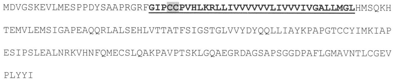 Фиг.1. Аминокислотная последовательность белка-предшественника hSP-С. Жирным подчеркнутым шрифтом отмечена последовательность зрелого hSP-C. Фоном отмечены остатки цистеина, к которым присоединяются пальмитиновая кислота в припосттрансляционном процессинге.