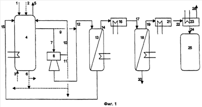 Трубопровод 12, ведущий к выпарному аппарату с падающей пленкой жидкости 13, может быть перекрыт в течение части фазы ферментации с учетом предельно допустимых уровней материала в ферментационном резервуаре 4 и предельно допустимого потока в трубопроводе 1. В среднем в резервуар-накопитель продукта 25 поступает смесь этанола и воды, содержащая примерно 40 мас.% этанола, и эта концентрация является достаточной с учетом последующей переработки.