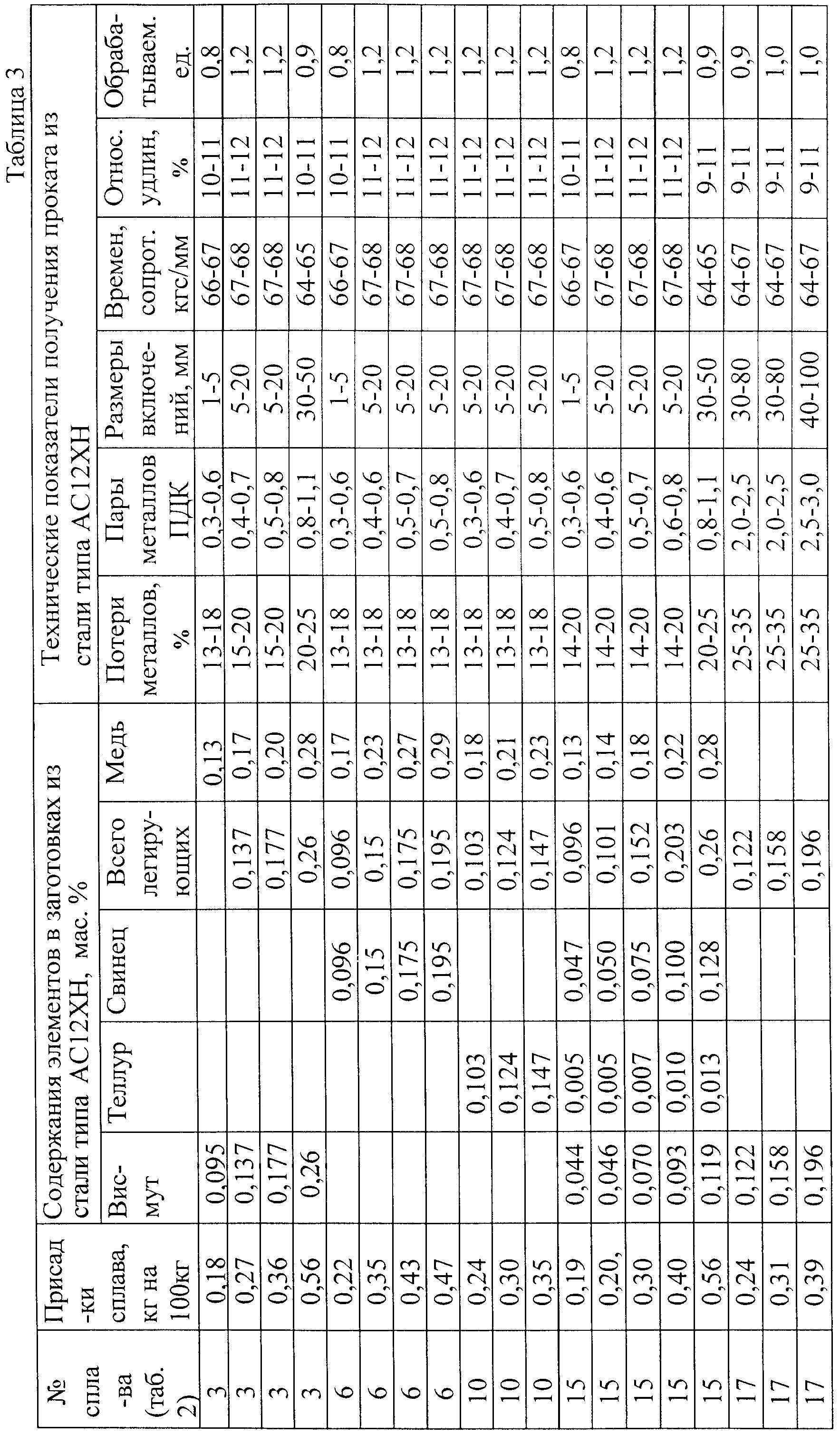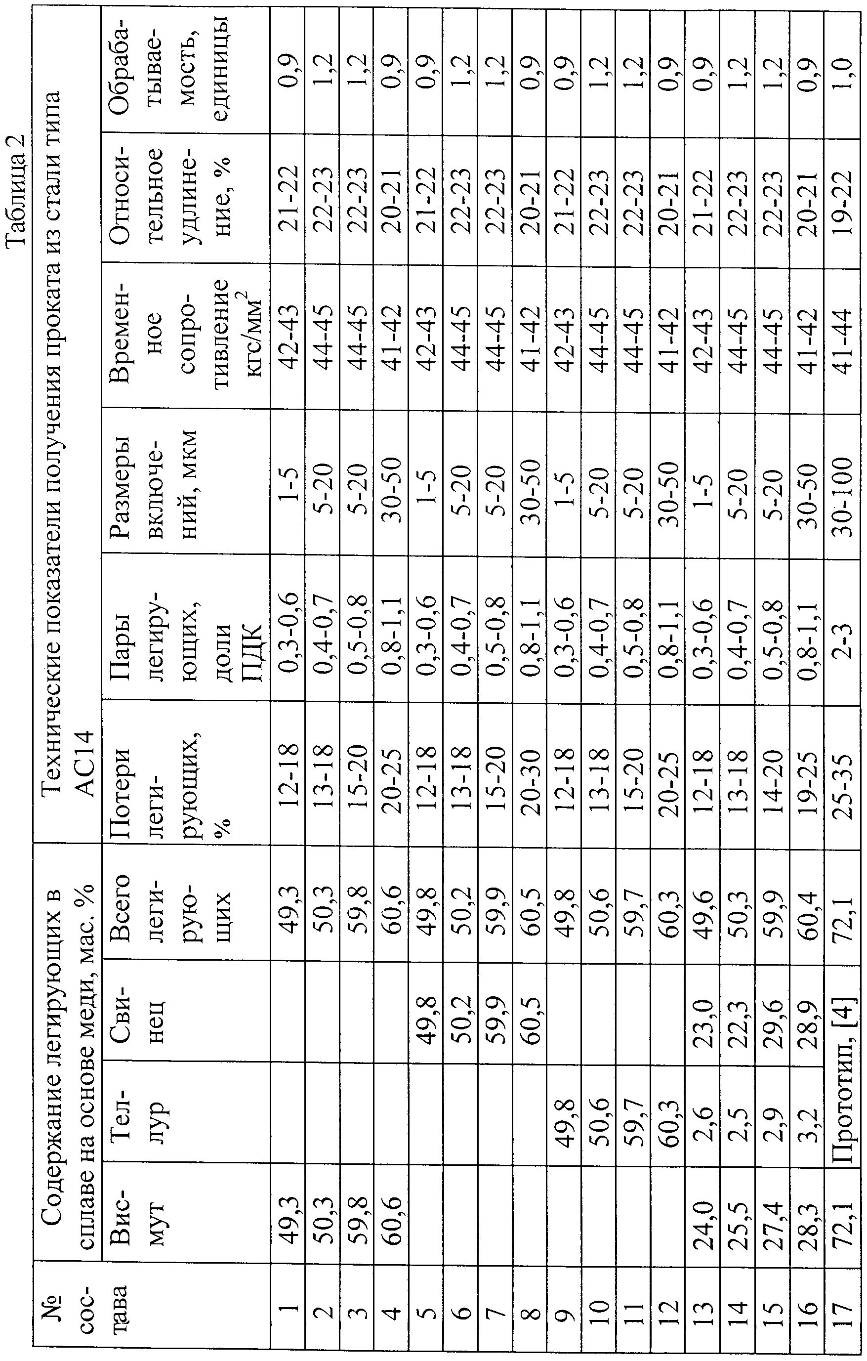 Изобретение относится к черной металлургии, в частности к технологии получения стали высокой обрабатываемости резанием для массового и быстрого изготовления болтов, гаек и других деталей для машиностроения и автомобилестроения. Известны способы легирования такой стали, включающие введение в струю расплава стали (при разливке в изложницы, кристаллизатор, ковш и др.) элементов, повышающих обрабатываемость стали (свинца или висмута), в виде дроби (в том числе покрытой графитом), частиц, кусков, прутков, гранул [1-3]. Недостатком этих способов легирования являются высокие потери (30-60%) при введении в струю элементов, повышающих обрабатываемость стали, что удорожает производство сталей высокой обрабатываемости. Интенсивное испарение и окисление приводит к очень неоднородному распределению в стали этих элементов, усложняет получение оптимального размера их включений в расплаве и в заготовках, что сопровождается нестабильностью обрабатываемости заготовок стали и большими колебаниями их механических свойств. Кроме этого, выделяющиеся в процессе легирования ядовитые пары легирующих металлов и их оксидов (1 и 2 класса опасности) загрязняют рабочую зону до концентраций, превышающих в 2 и более раз предельно допустимые в воздухе концентрации (ПДК). Наиболее близким по технической сущности и достигаемому результату является способ легирования висмутом сталей высокой обрабатываемости резанием, заключающийся во введении в струю расплава сплава висмута с марганцем, содержащего 70-75% висмута и 25-30% марганца [4]. Практика легирования стали высокой обрабатываемости резанием известным способом [4] и изготовления из них деталей выявила следующие недостатки: – высокие (25-50%) потери легирующих элементов (висмута и марганца) при их введении в расплав; – нестабильный и невысокий уровень обрабатываемости и механических свойств заготовок стали из-за неравномерного распределения в них частиц висмута неоптимального размера; – загрязнение рабочей зоны парами висмута и марганца; – увеличенная стоимость заготовок стали высокой обрабатываемости резанием за счет высоких потерь легирующих элементов. Задачей изобретения является создание способа легирования стали высокой обрабатываемости резанием элементами, повышающими обрабатываемость, позволяющего уменьшить потери легирующих элементов и снизить стоимость стали, обеспечить необходимые и стабильные обрабатываемость и механические свойства за счет повышения равномерности распределения включений легирующих элементов оптимального размера, улучшить санитарно-гигиенические условия рабочей зоны. Поставленная задача решается тем, что в заявленном способе легирования стали высокой обрабатываемости резанием для заготовок, суммарное содержание в котором одного или нескольких легколетучих металлов из висмута, теллура, свинца составляет 0,10-0,25 мас.%, в расплав стали вводят легирующие элементы, в виде сплава на основе меди, содержащего один или несколько из указанных металлов, суммарное содержание которых в нем составляет 50-60 мас.%. В прототипе в расплав стали при температуре 1550-1650°С вводится сплав, содержащий 70-75% висмута и 25-30% марганца [4]. Висмут и марганец при такой температуре испаряются и сгорают в оксиды (потери при этом составляют 25-50%), что приводит к удорожанию стали, неравномерному р