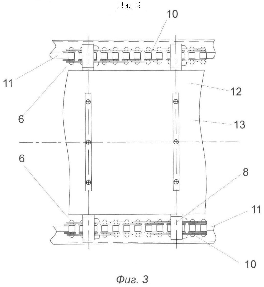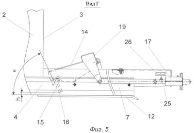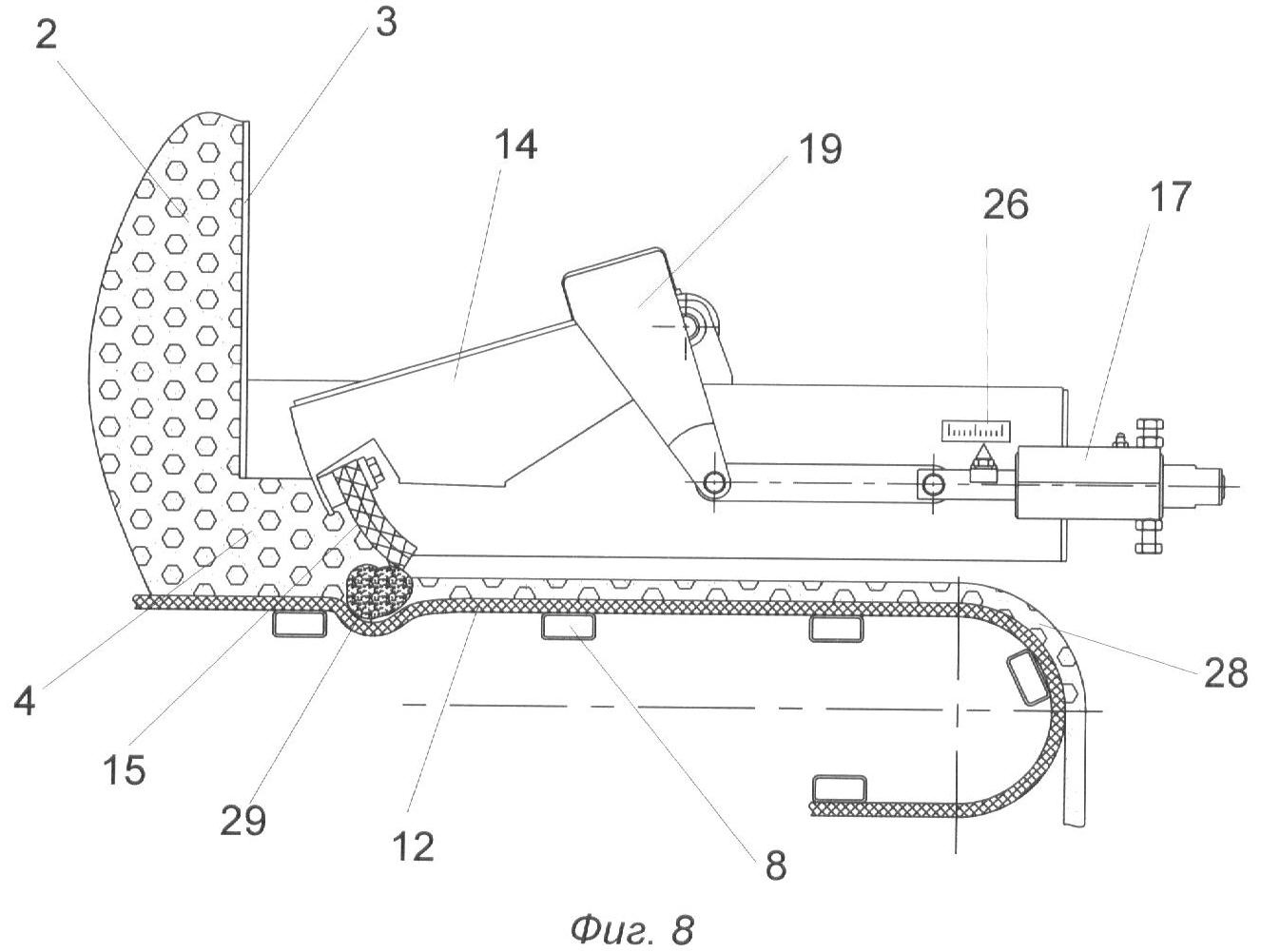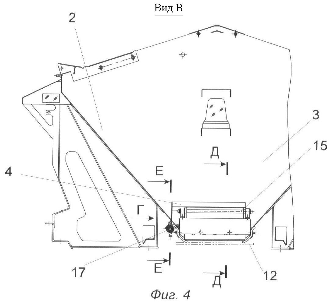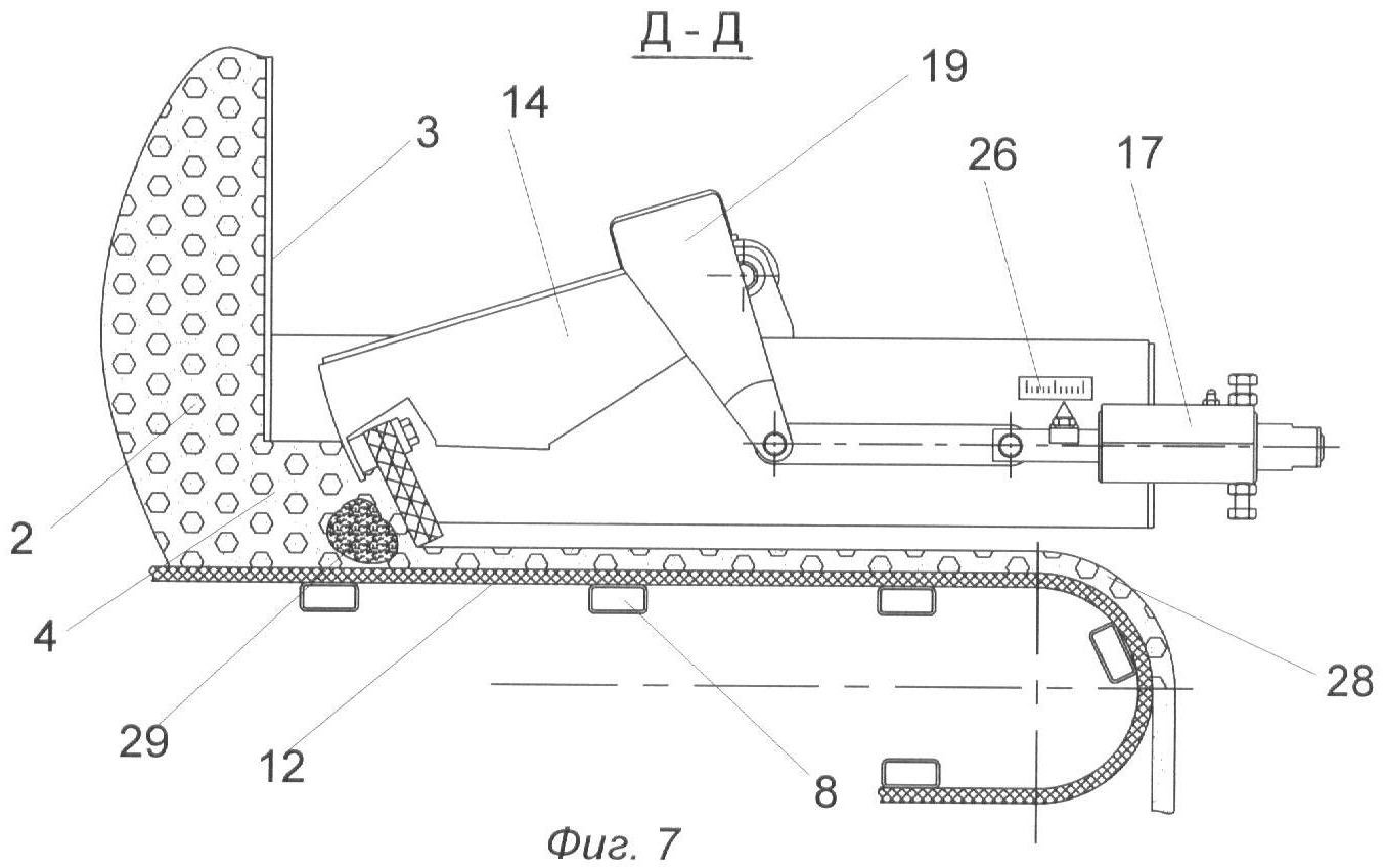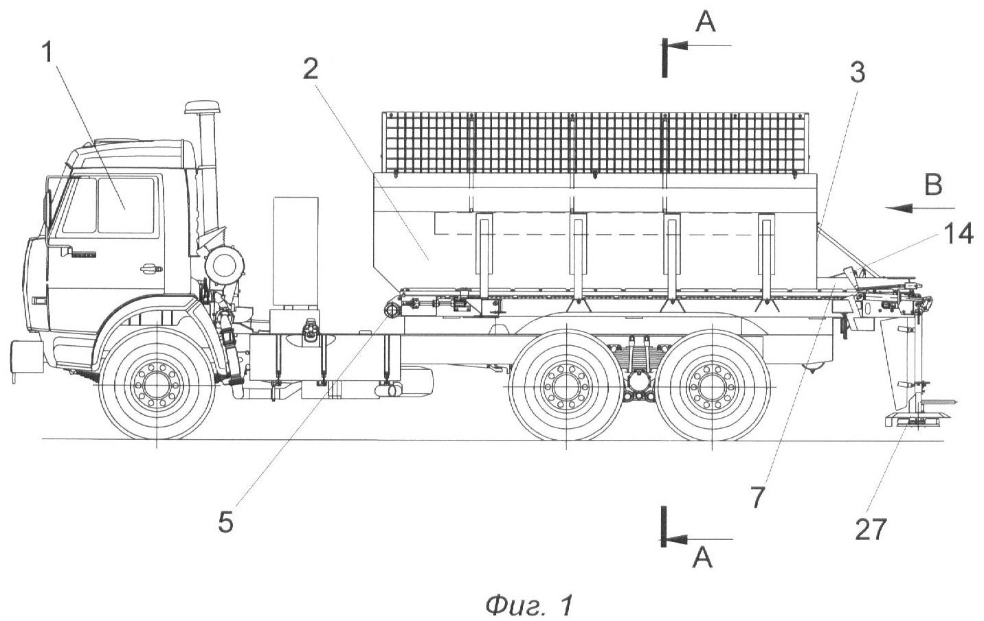 Распределитель сыпучих противогололедных реагентов содержит транспортное средство 1, на котором установлен бункер 2. Бункер 2 имеет заднюю стенку 3, в которой образовано разгрузочное окно 4. Внутри бункера 2 расположен конвейер 5, имеющий боковые части 6 относительно продольной оси конвейера (фиг.3), и концевую часть 7, размещенную за задней стенкой 3 бункера 2. Конвейер 5 выполнен цепным со скребками 8, которые связаны со звеньями 9 цепей 10 по обе стороны конвейера 5. Цепи 10 верхней ветви конвейера 5 опираются на направляющие 11, которые жестко прикреплены к бункеру 2 в нижней его части. Между цепями 10, которые смещены к боковым частям 6 конвейера 5, на скребках 8 сверху закреплена бесконечная гибкая лента 12. Бункер 2 выполнен бездонным, открытый проем которого расположен над лентой 12 верхней ветви конвейера 5 (фиг.2). Крепление ленты 12 к скребкам 8 может быть также снизу скребков 8 (не показано). Сверху ленты 12 установлены планки 13 для крепления, исполняющие также функцию дозирующих скребков, имеющих малую высоту (не более 10 мм). Над концевой частью 7 конвейера 5 шарнирно смонтирована заслонка 14, которая имеет лобовой элемент 15, обращенный в сторону разгрузочного окна 4. Лобовой элемент 15 заслонки 14 выполнен из гибкого материала, например конвейерной резины. Лобовой элемент 15 наклонен к поверхности ленты 12 конвейера 5 под острым углом (фиг.5) с вершиной, которая обращена в сторону, противоположную задней стенке 3 конвейера 5. На лобовом элементе 15 имеется нижняя кромка 16 (фиг.5), расстояние от которой до поверхности конвейера 5 можно изменять поворотом заслонки 14 в вертикальной плоскости регулировочным механизмом 17. Регулировочный механизм 17 включает в себя тягу 18, которая присоединена одним своим концом к заслонке 14 через рычаг 19. На другом конце тяга 18 связана с толкателем 20, помещенным во втулку 21 и имеющим внешнюю резьбу 22, на которую навинчена гайка 23, зафиксированная от продольных перемещений во втулке 21 при помощи фиксаторов 24. Втулка 21 жестко присоединена к концевой части 7 конвейера 5. На толкателе 20 установлен указатель 25 высоты нижней кромки 16 лобовой поверхности 15 заслонки 14 относительно конвейера 5. На концевой части 7 конвейера 5 расположена шкала 26 с нанесенными на нее градуированными делениями, отражающими расстояния между поверхностью ленты 12 конвейера 5 и нижней кромкой 16 лобового элемента 15. Указатель 25 установлен напротив шкалы 26. За концевой частью 7 конвейера 5 на транспортном средстве 1 установлен приводной разбрасывающий диск 27, который распределяет противогололедные реагенты 28 на дорожную поверхность.