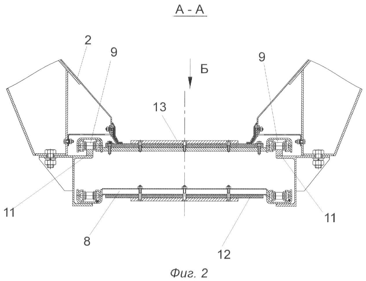 На фиг.1 показан распределитель противогололедных материалов, вид сбоку; на фиг.2 – разрез А-А на фиг.1; на фиг.3 – вид Б на фиг.2; на фиг.4 – вид В на фиг.1; на фиг.5 – вид Г на фиг.4; на фиг.6 – разрез Е-Е на фиг.4; на фиг.7 – разрез Д-Д на фиг.4 в положении твердого включения противогололедного материала до соприкосновения с лобовым элементом; на фиг.8 – разрез Д-Д на фиг.4 в положении твердого включения противогололедного материала после соприкосновения с лобовым элементом в процессе его прохождения в зазоре между нижней кромкой лобового элемента и лентой конвейера.