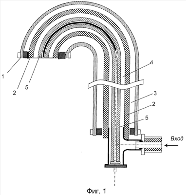 На фиг.1 изображен вариант динамического элемента 2, который представляет собой эластичный трубчатый элемент, установленный в подающей трубе 1 с зазором 3. Полость 4 для подачи воды соединена гидравлически через напорный клапан (не показан), например, с напорным питающим водоводом – водопроводной сетью (не показан).