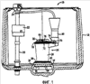Промывной клапанный узел 26 расположен вертикально в бачке 12 и включает в себя корпус 28 клапана, переливную трубу 30 и затвор 32 в виде створки. Корпус 28 клапана и переливное устройство 30 предпочтительно выполнены из некорродирующего материала, такого как пригодный пластик. Нижний конец корпуса 28 клапана имеет три выступа 36, которые используются для сцепления с нижней стороной горизонтальной стенки 16, и наружный фланец 38 с соответствующей прокладкой 40 входит в контакт с верхней стороной стенки 16, что обеспечивает крепление промывного клапанного узла 26 к бачку 12. Данное соединение аналогично соединению, раскрытому в патенте США 4433446, который переуступлен правопреемнику по настоящему изобретению и описание которого, в частности фиг.2 и 4А-6 и их соответствующее описание, включено в настоящее описание в качестве ссылки.